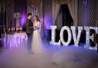 Sceneria ślubna w sam raz dla wielbicieli srebra, bieli i zimniejszych odcieni. Idealnie na zimowy ślub w klimacie Królowej Śniegu. ALE – zobaczcie, tutaj ten magiczny efekt wzmocniły fioletowe podświetlenia..