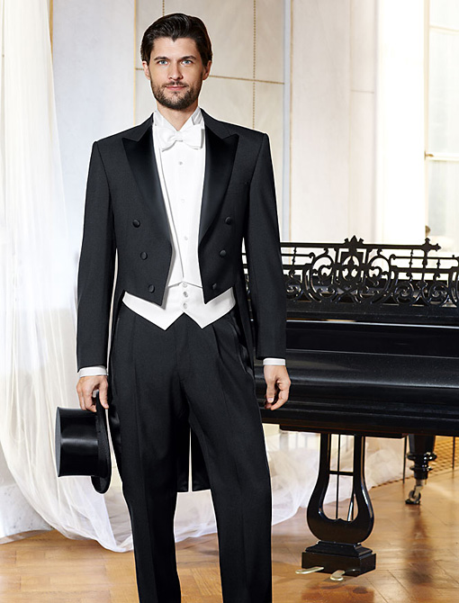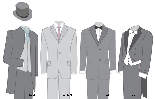Frak z czarną kamizelką jest najbardziej eleganckim dziennym strojem męskim noszonym w najbardziej uroczystych okazjach. Ojcom polecamy smokingi z czarnym pasem smokingowym i do tego koniecznie wiązana mucha. Kolor dodatków może być również dopasowany do sukienki małżonki (mamy). Ostatnio dużym zainteresowaniem cieszy się klasyczna stójka, do której można założyć elegancki jedwabny, błyszczący krawat.