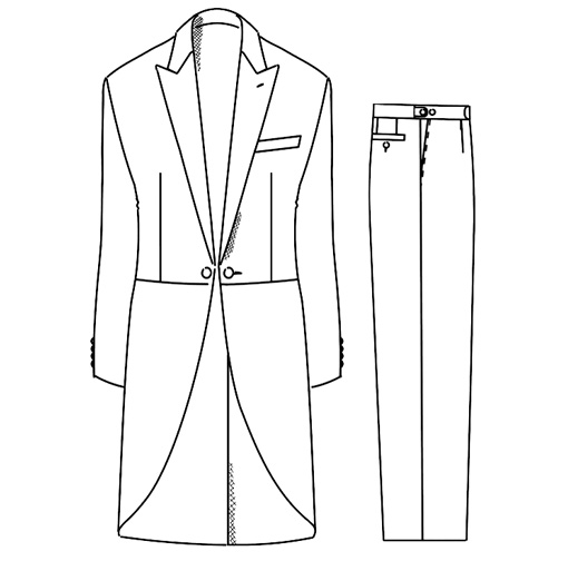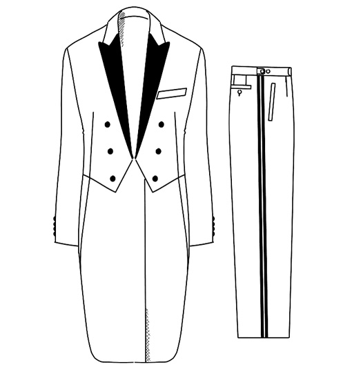 Klasyczny frak uszyty jest z czarnego sukna, jego klapy pokryte są jedwabnym atłasem. Spodnie nie mają żadnych mankietów, ale na zewnętrznych szwach znajdują się podwójne jedwabne lampasy. Do fraka nosi się specjalną koszulę z bardzo sztywnym gorsem i usztywnianymi mankietami. Stojący kołnierzyk z zagiętymi rogami zdobi biała muszka. Tradycyjnym uzupełnieniem stroju jest biała kamizelka, szalik i białe rękawiczki oraz czarne lakierki.