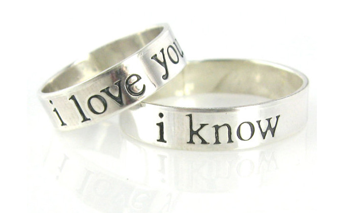 Obrączki mogą mieć też grawerkę na zewnątrz, jak te z cytatem kultowego dialogu Hana Soli i księżniczki Lei – oczywiście dla fanów i koneserów Gwiezdnych Wojen.