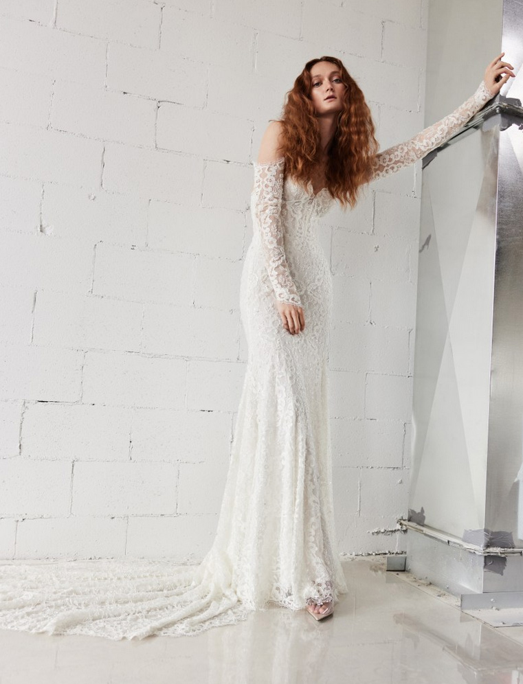 Wyrazista koronka jest od zawsze wykorzystywana w kolekcjach sukien ślubnych. Zarówno na całości sukienki, jak i w roli wstawek w coraz ciekawszych konstrukcyjnie fasonach. Tutaj chcę zwrócić Waszą uwagę na taką solidniejszą koronkę, która sprawia wrażenie może nawet cięższej, gęstej. Może być skrojona przy ciele, lejąca jako wierzchnia warstwa lub plastycznie układająca się na figurze.