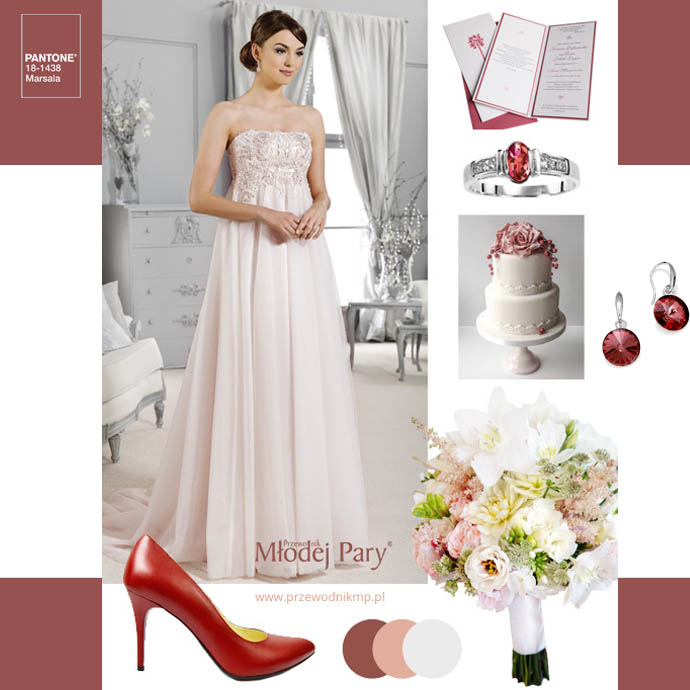 Marsala świetnie sprawdza się w dodatkach – może być dobrą alternatywą dla czerni czy czekoladowych brązów, jeśli postawicie na proste formy. Idealnie pasuje do pudrowych odcieni różu z domieszką czerwieni. Będzie pięknie współgrać z modnymi w tym sezonie pastelowymi i pudrowymi sukniami ślubnymi.