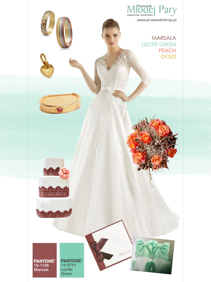 Mamy nadzieję, że zwolenniczkom popularnego bordo, marsala zastąpi ten niefortunny kolor w ślubnej oprawie. Oczywiście, marsala wcale nie musi występować solo, ani w monochromatycznych kompozycjach. Pięknie łączy się również ze złotem, miętą (lucite green) czy brzoskwinią. Jest to pogodna, romantyczna gama kolorystyczna – idealnie będzie tutaj pasowała koronkowa suknia ślubna i buty z dziewczęcą kokardką.