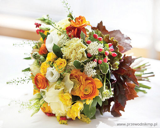 Letnią, gorącą kolorystykę bukietu pięknie wyczuła Pani Grażyna z Kwiaciarni Alma. Taki bukiet rozświetli twarz panny młodej nawet w deszczowy dzień. O to chodziło:)