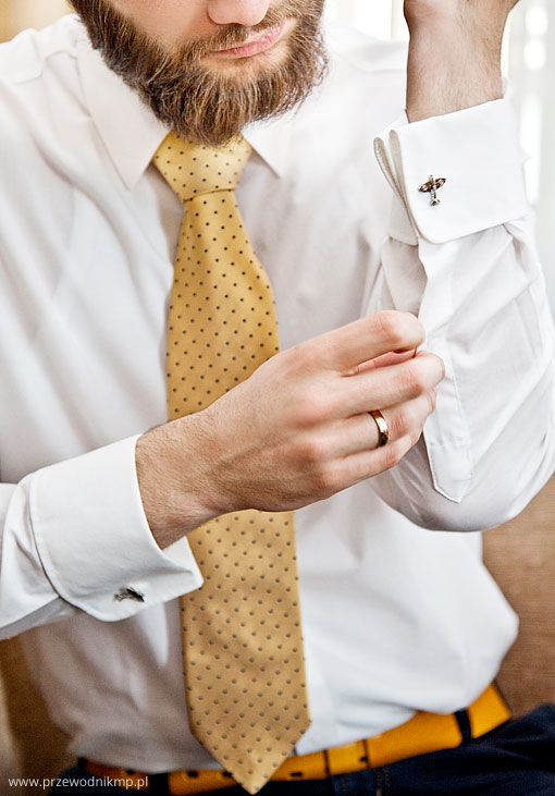 A tu proszę bardzo – panna młoda w klasycznej koronkowej sukni Pronovias, koku typu „banan”, wyrazistym makijażu „mocne oko + czerwone usta”… A pan młody? Pod krawatem ale… w spodniach podwiniętych do kostek i w skórzanych ciemnogranatowych butach z jasnymi sznurówkami. Mega modne połączenie! /widzicie ten pasek?