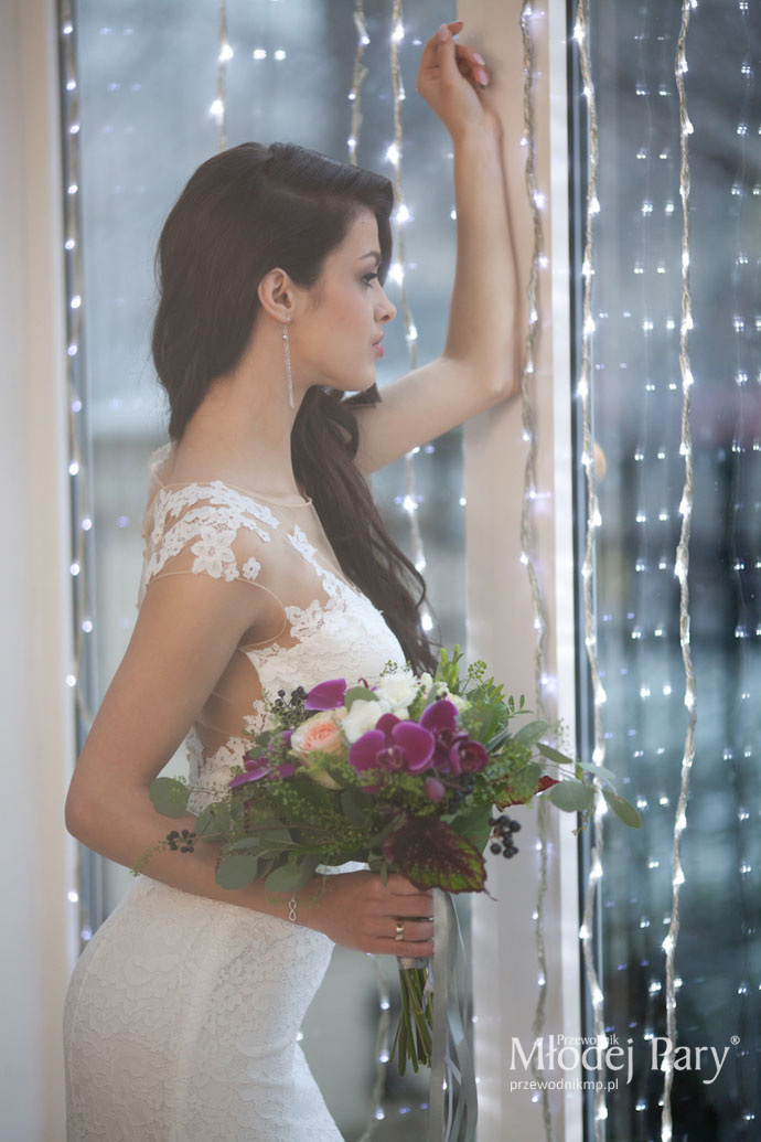 Szkło, lustra i gra światłem stały się, oczywiście oprócz młodej pary, głównymi bohaterami naszej sesji okładkowej w uroczym Hoteliku Brajt w centrum Wrocławia. Ekipa przygotowała tak wiele detali, że powstały trzy różne stylizacje. Zmiana sukienki i fryzury wystarczą przecież aby dziewczyna wyglądała jak z innej „bajki”. Pory dnia i aura zdecydowanie wymogły zmianę klimatu. Przeszklona sala hotelu oświetlona sznurami świateł zupełnie inaczej „zagrała” w dzień niż po zmroku, czego efekty możecie zobaczyć wkrótce w innych artykułach. Przepiękna florystyka, dodatki i subtelne detale zagrały w kilku różnych odsłonach.