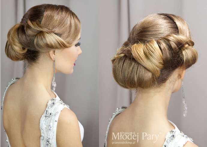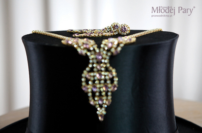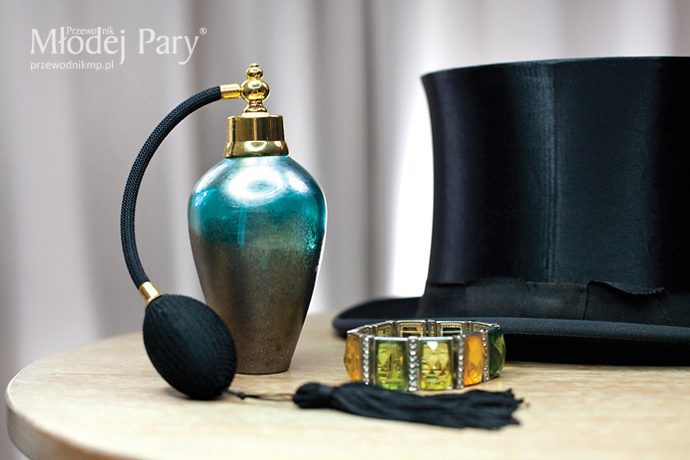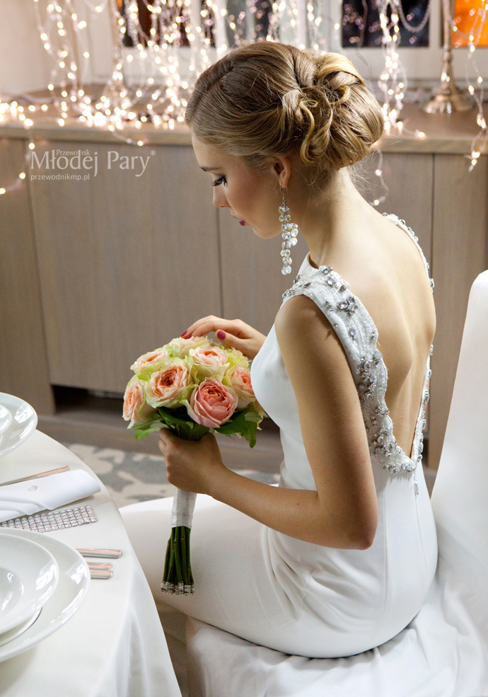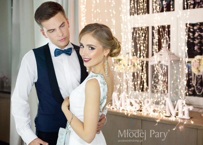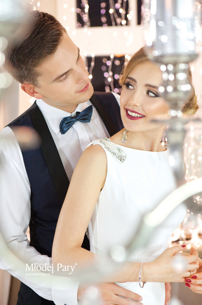 Prosta suknia panny młodej zaskakuje wykończeniem w stylu glamour – wyprowadzonym od ramiom wzdłuż wycięcia na plecach (efekt wow!) pasem ze srebrną nitką ozdobionym aplikacjami z białych koralików i różnej wielkości kryształów. Do tego duże wiszące kolczyki nawiązujące do zdobień sukni, klasyczny bukiet z róż, mocniejszy makijaż, srebrne stylowe buty i gotowe. Pan młody klasycznie, w smokingu i muszce, zawsze będzie wyglądał efektownie. Kamizelka smokingowa jest na tyle efektowna, że po zdjęciu marynarki pan młody prezentuje się nie mniej elegancko.