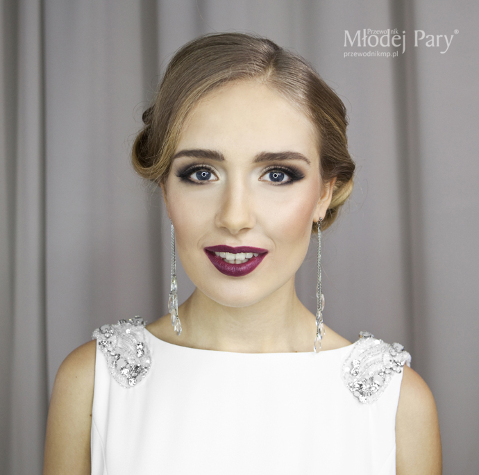 Wyrazisty makijaż i pomadka w kolorze czerwonego wina oraz finezyjnie upięta fryzura mocno dodają kobiecości. Wiszącymi kolczyki z kryształkami pięknie rozświetlają twarz.