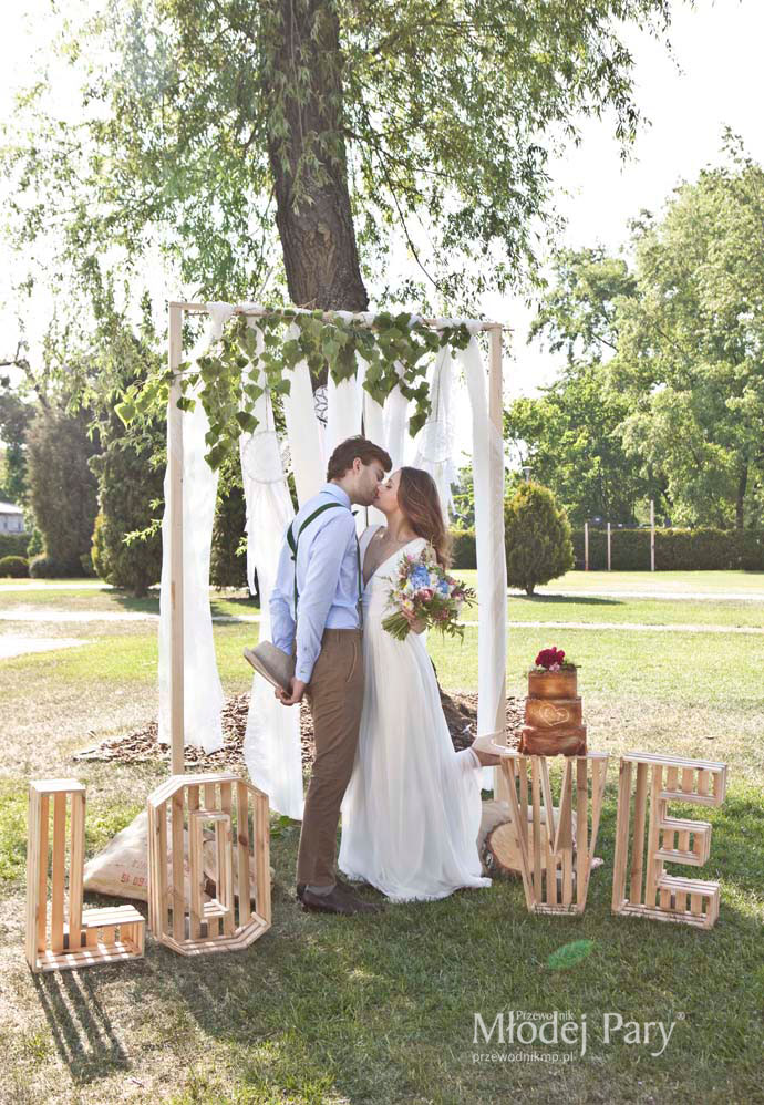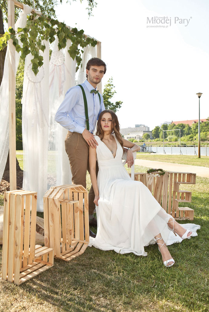 Wiosenny wiatr chłodził zabieganą ekipę, ale też próbował przewrócić konstrukcję. Specjalne worki obciążające (też w klimacie) rozwiązały problem. Zawieszone białe tkaniny, przyczepione gałązki brzozy, koronkowe łapacze snów… Do tego nonszalancko położone plastry drewna i plan mógł zostać uzupełniony rustykalnym napisem LOVE od Literowych Inspiracji. Tadamm! – Pstrykamy i wyciągamy z tego ustawienia kilka naprawdę magicznych ujęć.