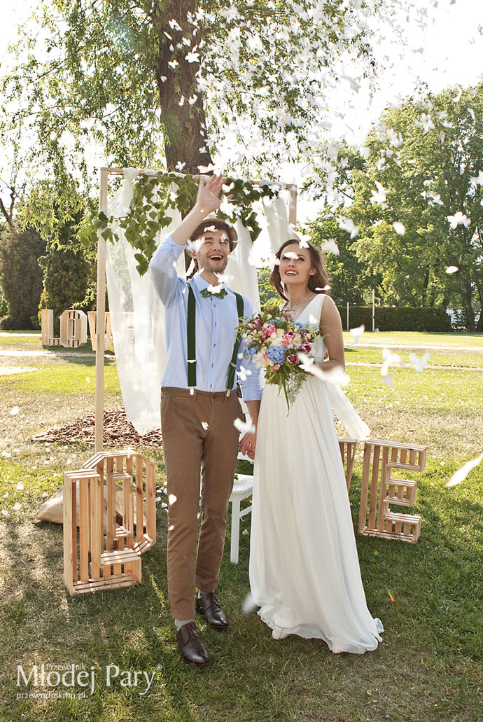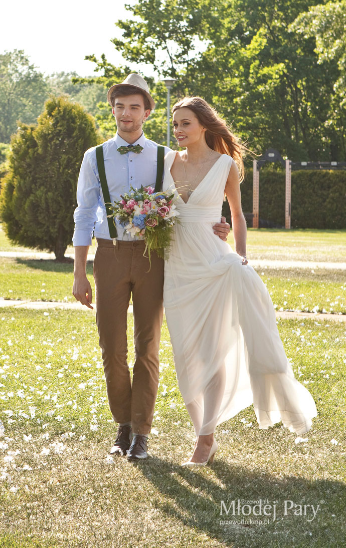 Pan młody zmienia strój od Diuka na mniej oficjalny, wkłada szelki i kapelusz. Panna młoda w zwiewnej sukni z Salonu Flossmann pięknie „pracującej” na wietrze i niezwykle swobodnej. I ten dekolt V – jeden z topowych trendów sukien ślubnych 2017. Rozwiane włosy, sielski wianek, wiosenny bukiet ślubny…