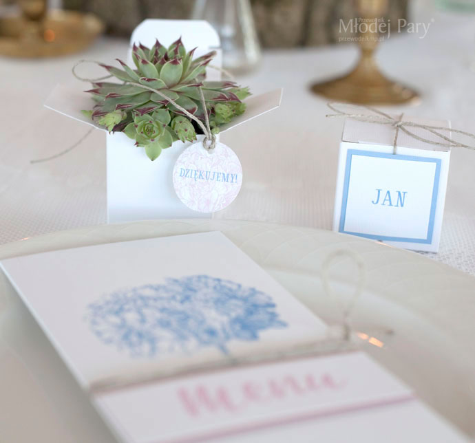 Ślubna papeteria od Petite łączy eko z motywem hortensji, które również występują w bukiecie. Mało tego – nawiązuje do kolorów roku 2016 według Pantone czyli delikatnego różu i transcendentalnego niebieskiego. I sukulenty, które szczególnie dobrze odnajdują się w sielskich klimatach. Rose quartz i serenity >>