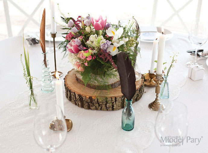 Ale cóż to? – Mamy jeszcze jedną opcję. W przeszklonej nowoczesnej sali przygotowujemy stoły udekorowane rustykalnymi dekoracjami. Plastry drewna, piórka, ale i mosiężne świeczniki. Bukiet na stole korespondujący z bukietem panny młodej. Biały, lekki, romantyczny „nagi” tort przystrojony kwiatami z bukietu panny młodej delikatnie wpisuje się w styl boho-rustykalny, nic nie tracąc z elegancji.