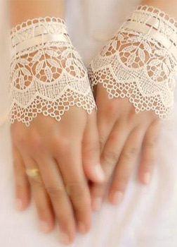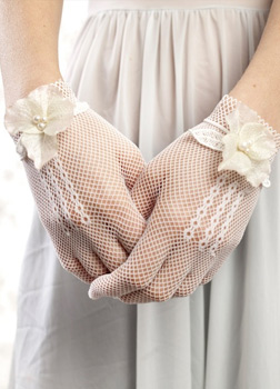Krótkie rękawiczki do nadgarstka pasują do sukien z rękawkami. Nie muszą być z gładkich tkanin – mogą być wykonane z delikatnej siateczki lub koronki – najważniejsze, żeby pasowały do sukienki – np. mogą być wykończone taką samą koronką. Gładkie rękawiczki powinny być wykonane z takiego samego materiału jak suknia ślubna, lub być w zupełnie innym kolorze (np. pudrowym różu), żeby uniknąć wrażenia że „prawie” udało się trafić w odcień . Ważne, żeby zwrócić uwagę na odcień rękawiczek i nie „przedobrzyć” jeśli suknia jest bogato zdobiona.