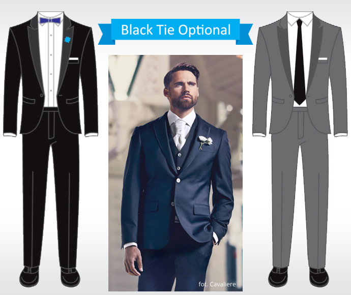 Standardowo obowiązuje jednorzędowa marynarka na jeden guzik. Opcjonalnie: butonierka i poszetka. Gładką koszulę można zamienić na koszulę z plisami. Talia nie może być odkryta.