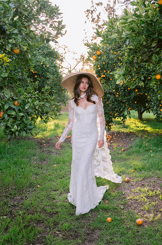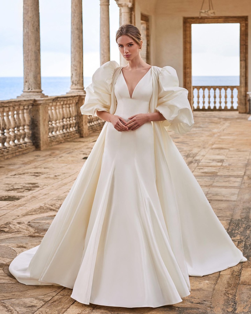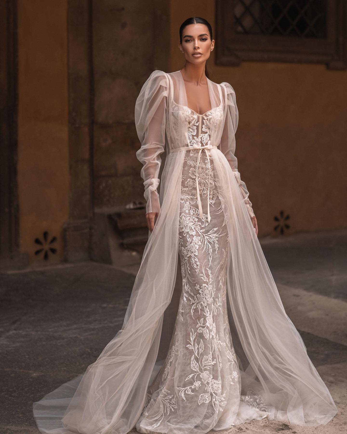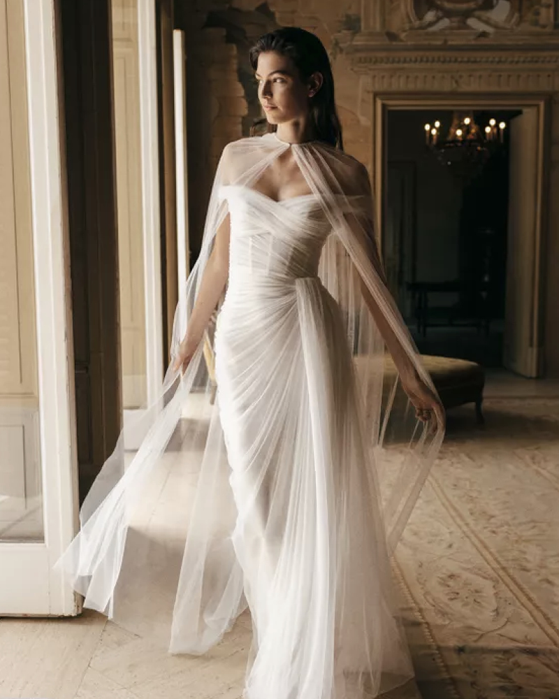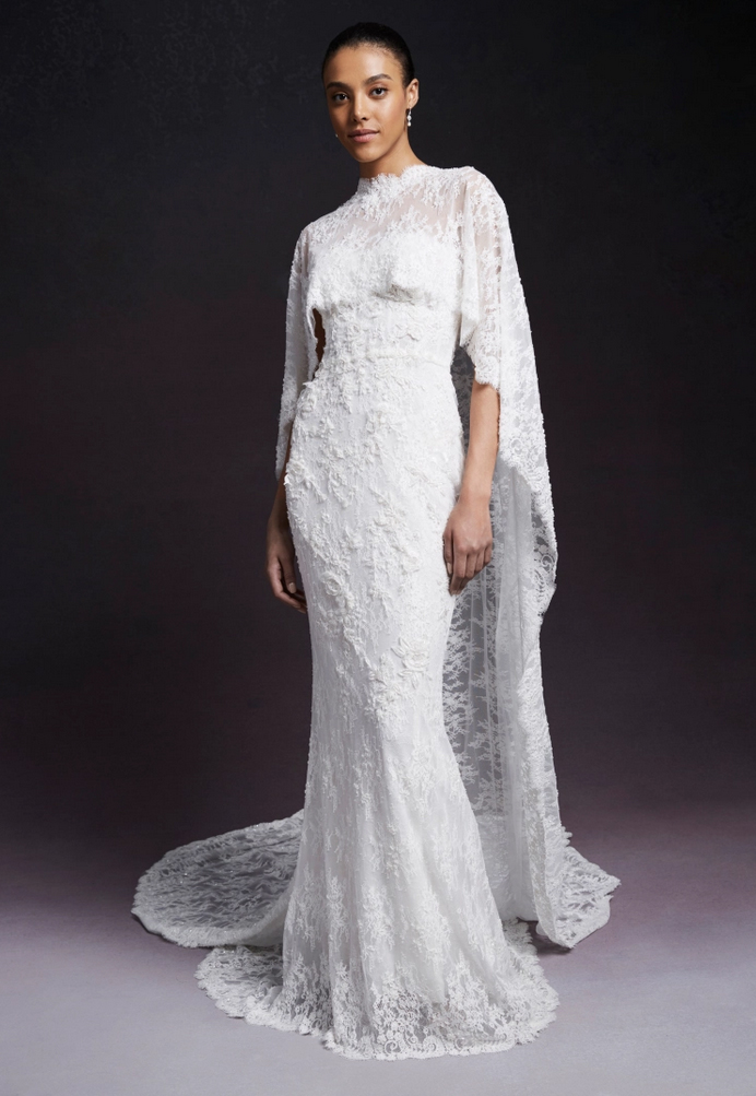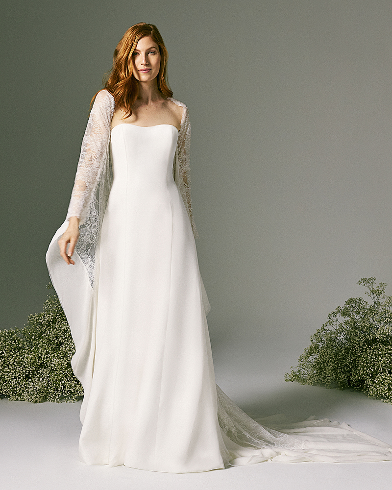 Minimalistyczna suknia ślubna z koronkową peleryną
