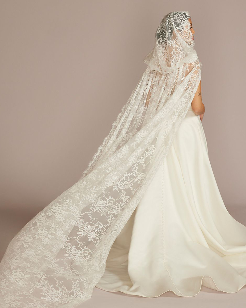 Sukienka może być całkiem skromna. Całą robotę zrobi stylowa peleryna, w której dzieje się dużo. W tej wersji sukienka zazwyczaj uszyta jest z gładkiej tkaniny. Ciekawie wygląda też, gdy uszyta jest z tej samej koronki na wierzchniej warstwie sukni. Minimalistyczny styl kontrastuje z gęstością wzoru peleryny. Zobaczcie na zdjęciu tyłem, pelerynę z koronkowym kapturem. Czyż to nie przepiękne połączenie?