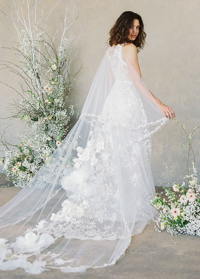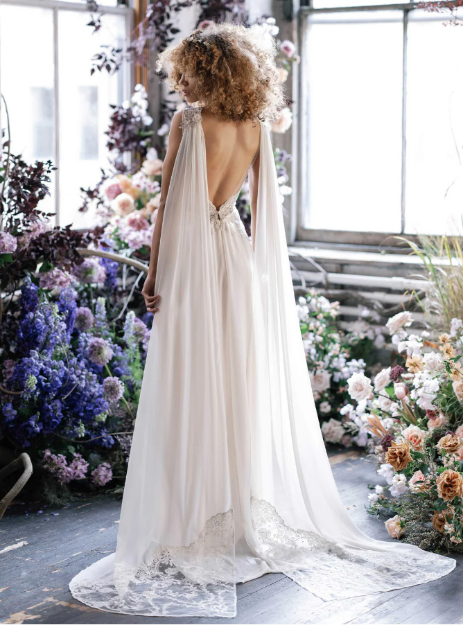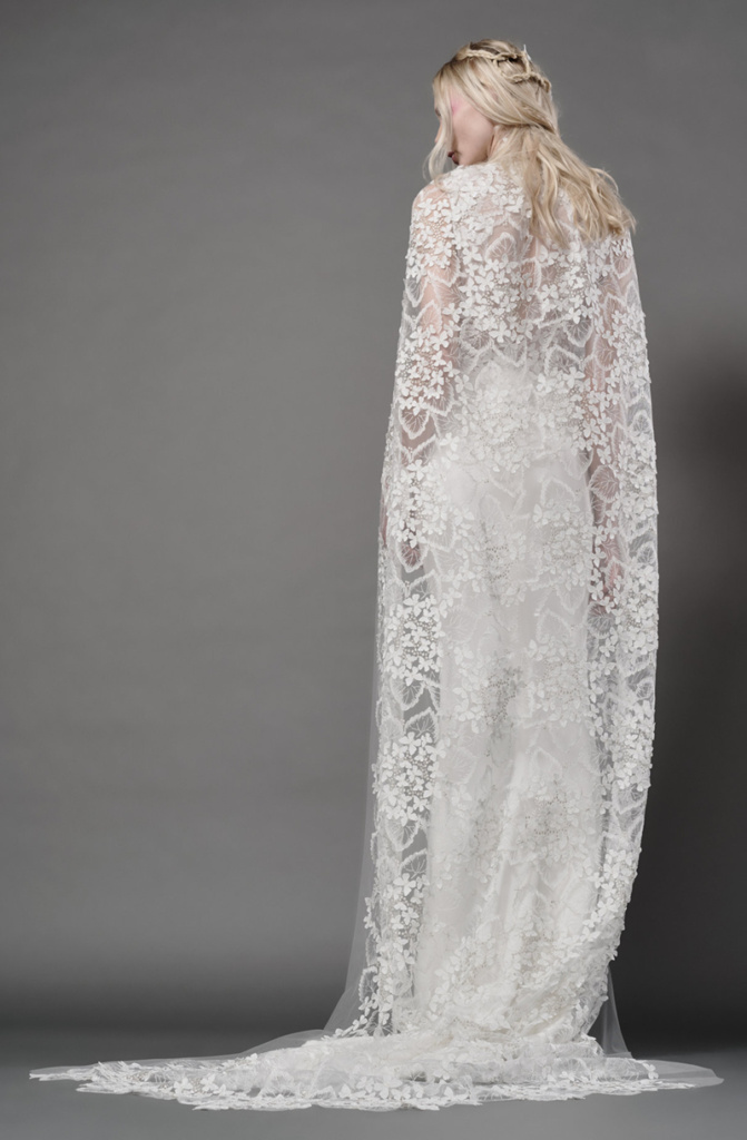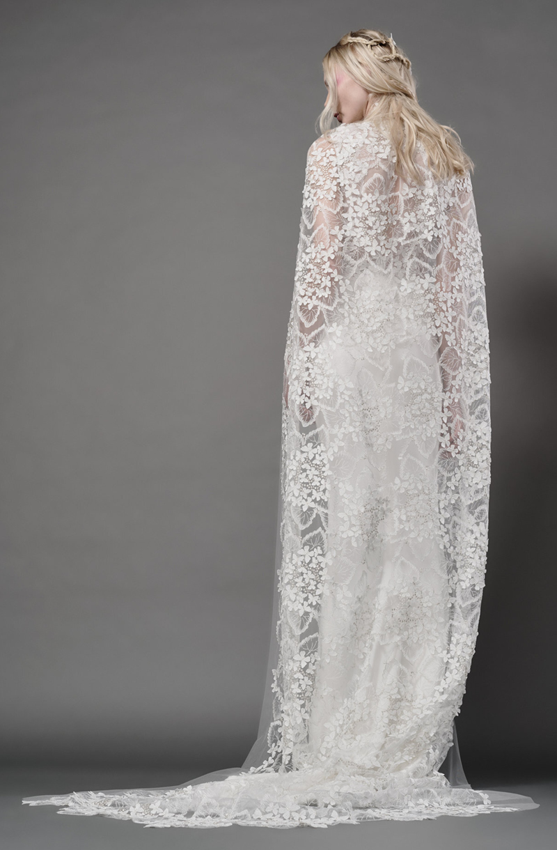 Peleryna ślubna może na pierwszy rzut oka tożsama z trenem. Taką opcję możemy znaleźć w niektórych fasonach sukien. Tren bywa odpinany lub na stałe przyszyty do sukienki.Wygląda bardzo podobnie, ponieważ jest przymocowany na wysokości ramion. Może być jednoczęściowy lub składać się z dwóch części, jak na pierwszym zdjęciu. W minimalistycznej kreacji Oskara de la Renta tren wyprowadzony jest w zaskakującym miejscu – poniżej łopatek. Można sobie spokojnie wyobrazić, jak pełni funkcję peleryny czy welonu. Zarówno do zakrycia odsłoniętych ramion i dekoltu, jak i na potrzeby szałowych zdjęć ślubnych.