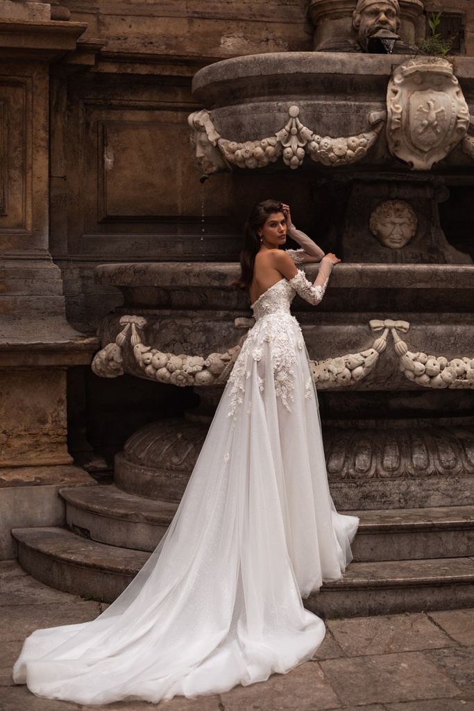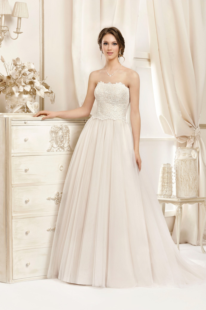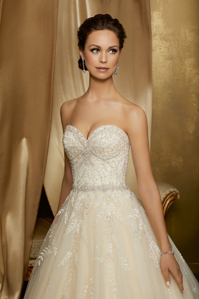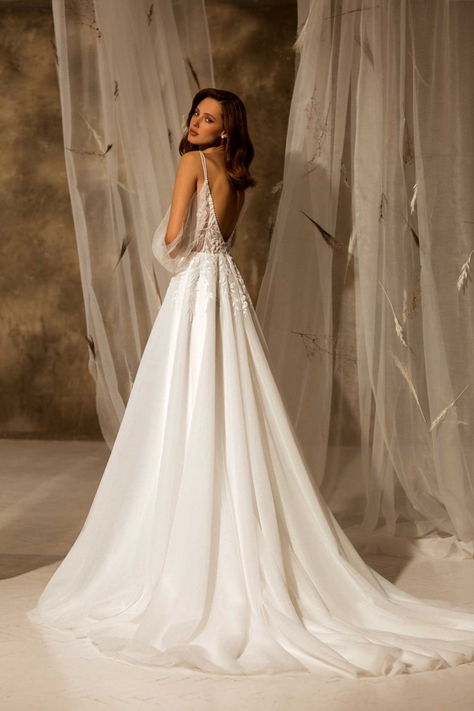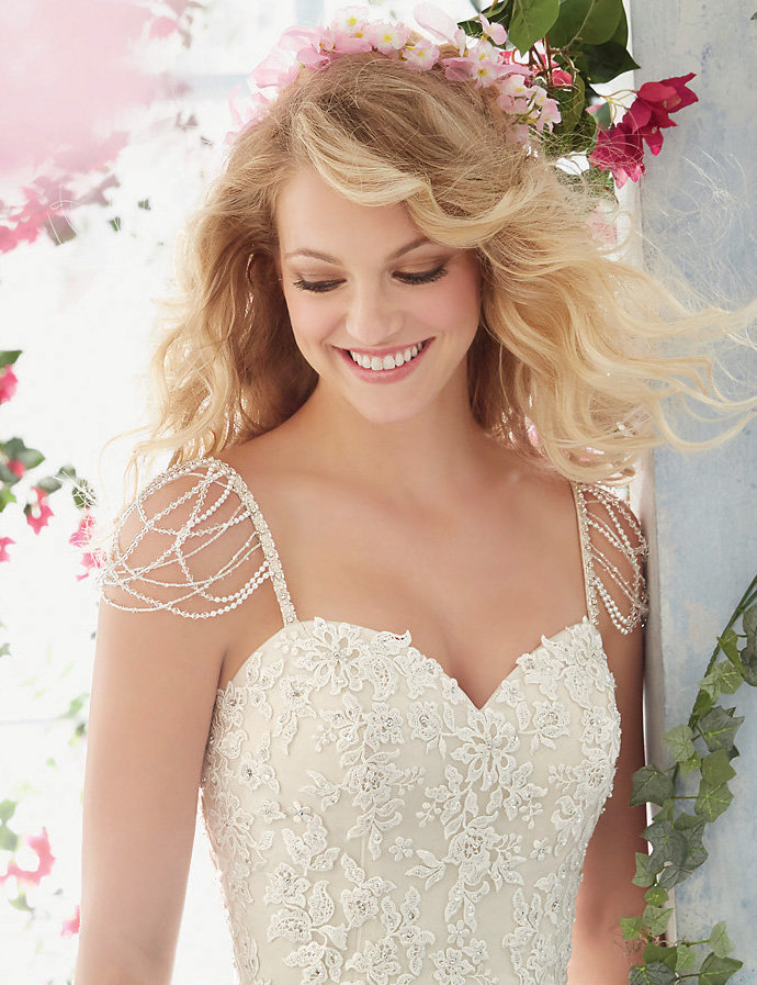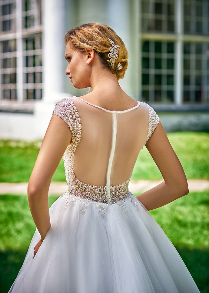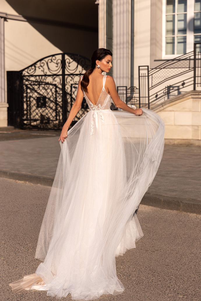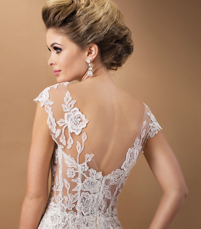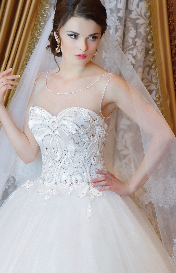 Odkryty dekolt wycięty w serce, połączony ze zwężonymi ramiączkami ozdobionymi kryształkami. Ten krój pięknie podkreśla i podtrzymuje biust. Biżuteryjne wykończenie dodaje mu klasy. Wysadzane kryształkami i kamieniami ramiączka sukni mogą być jej główną ozdobą. To kolejna odsłona sukien z subtelnym wydźwiękiem glamour. Perełki na plecach są jednocześnie guziczkami zapinającymi koronkowo-tiulowe romantyczne plecy sukienki.