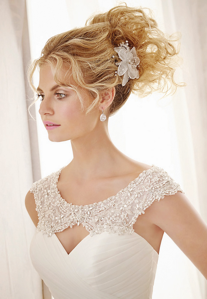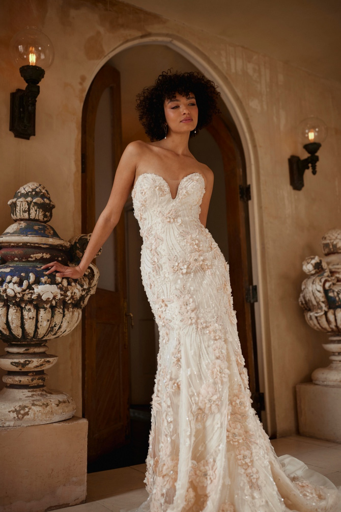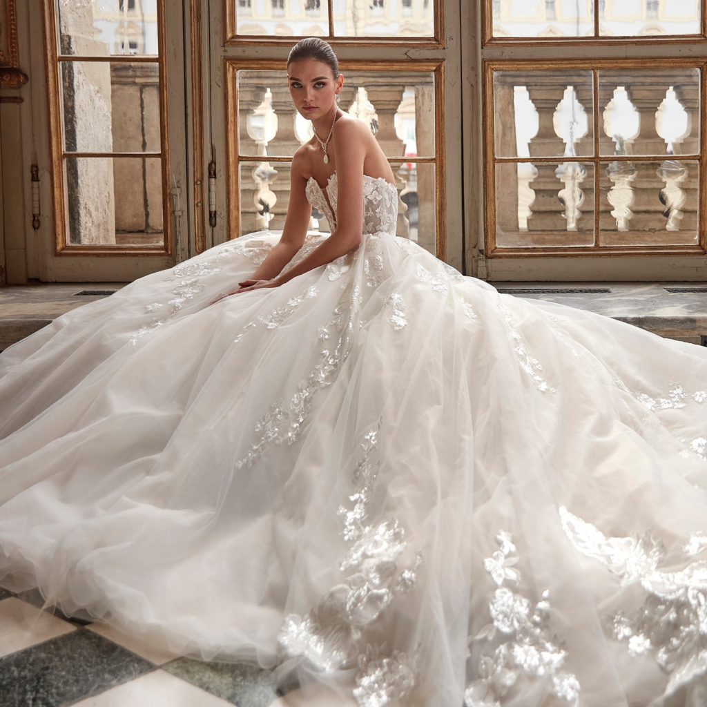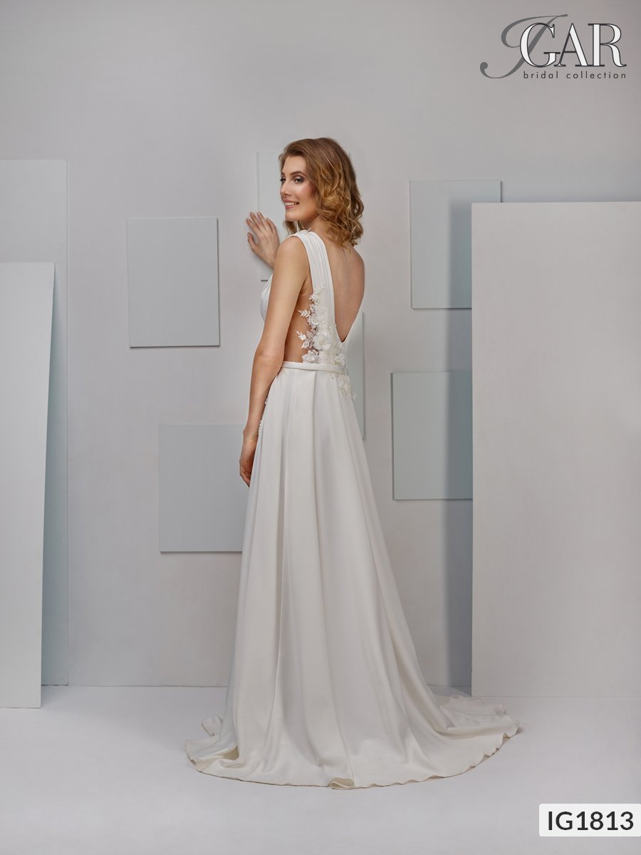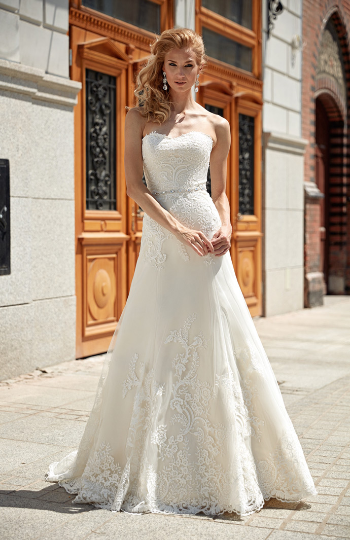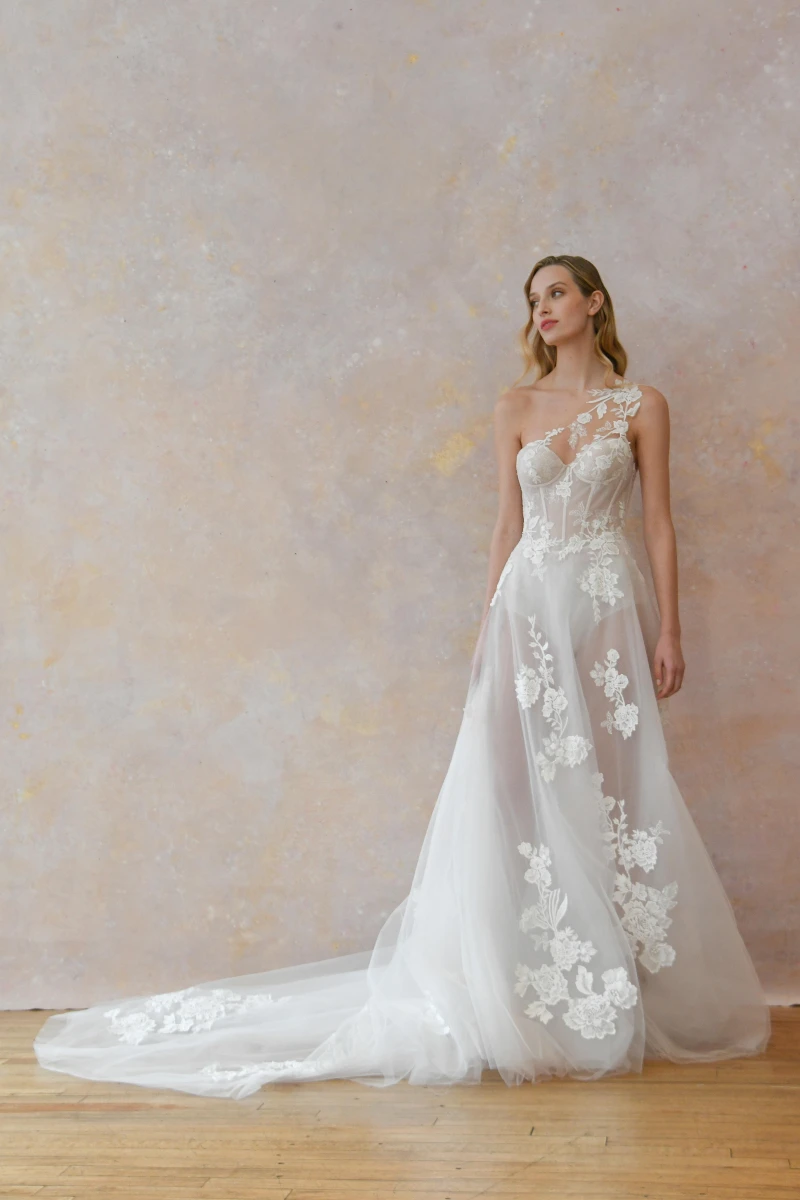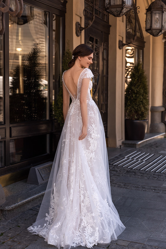 Odkryty dekolt wycięty w serce, połączony ze zwężonymi ramiączkami ozdobionymi kryształkami. Ten krój pięknie podkreśla i podtrzymuje biust. Biżuteryjne wykończenie dodaje mu klasy. Wysadzane kryształkami i kamieniami ramiączka sukni mogą być jej główną ozdobą. To kolejna odsłona sukien z subtelnym wydźwiękiem glamour. Perełki na plecach są jednocześnie guziczkami zapinającymi koronkowo-tiulowe romantyczne plecy sukienki.