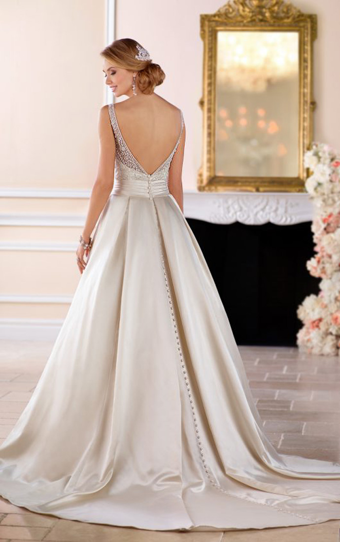 Bardzo głębokie dekolty z tyłu eksponują odsłonięte plecy. Samo wycięcie może być ozdobione na różne sposoby – od haftu, grubej koronki, poprzez satynowe obszycia i wykończenie taśmą z koralikami czy kryształkami. Wciąż modne są kokardy w pasie, skromniejsze z przodu i często bardzo okazałe z tyłu sukien. Gładkie zabudowane satyną plecy podobają się nowoczesnym księżniczkom, ale i zwolenniczkom wysmakowanego minimalizmu.