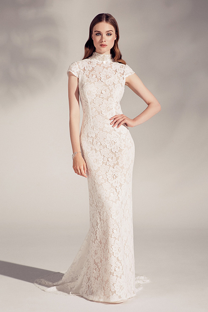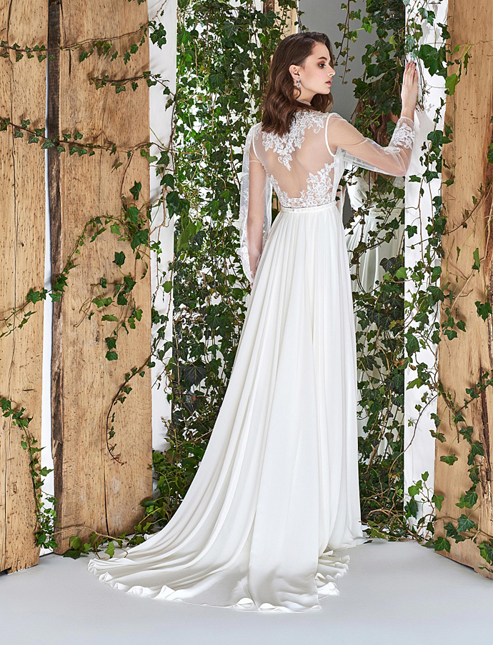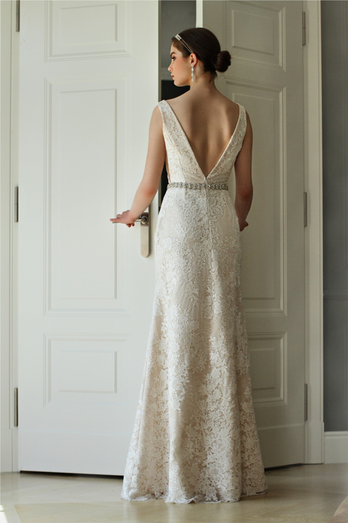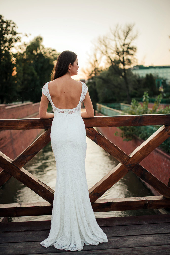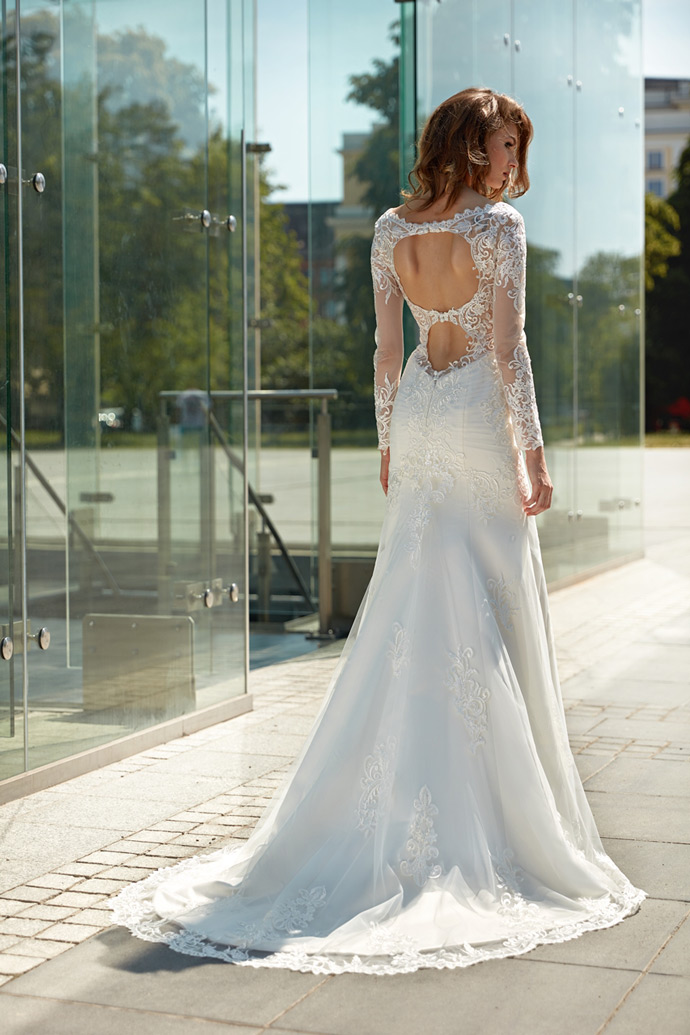 Odkryte plecy mogą też być najatrakcyjniejszym atrybutem sukni ślubnej. Głęboko wycięty dekolt i na przykład dla równowagi zabudowany przód?
