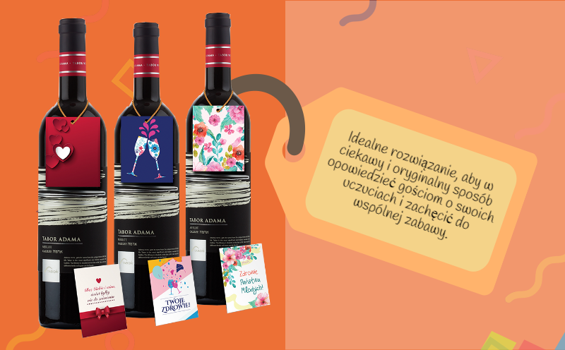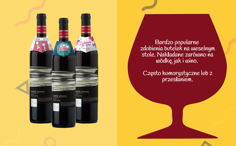 Charakterystyczne karteczki zaczepiane na szyjkach butelek. Bardzo często umieszcza się na nich imiona nowożeńców i datę ślubu. Pojawiają się także wierszyki i anegdoty na temat małżeńskiego życia. Oprócz gotowych propozycji możemy wykazać się kreatywnością i stworzyć swój własny tekst.