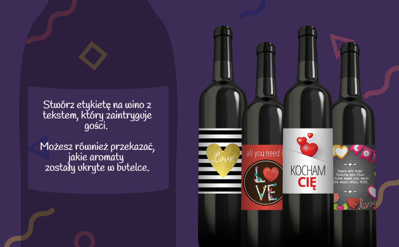 Ciekawym rozwiązaniem jest zamieszczenie na butelkach informacji, do którego z dań w weselnym menu najlepiej pasuje konkretne wino. Warto dopisać, z jakiego kraju pochodzi oraz jakich aromatów możemy się w nim doszukać np.: Białe, wytrawne wino z Włoch, bogate w aromaty owoców tropikalnych. Polecamy skosztować w towarzystwie krewetek. Taka informacja z pewnością zaciekawi gości oraz zachęci do zabawy w degustację i poszukiwania opisanych smaków.