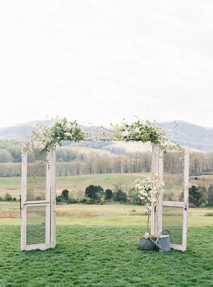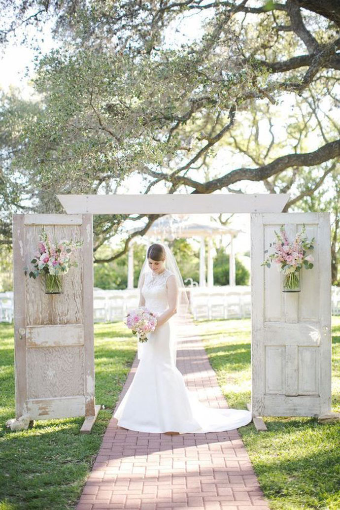 Piękne wmontowane w plenerze drzwi – najczęściej rustykalne, które też mają symbolizować wejście w nową rodzinę, do własnego wspólnego domu.