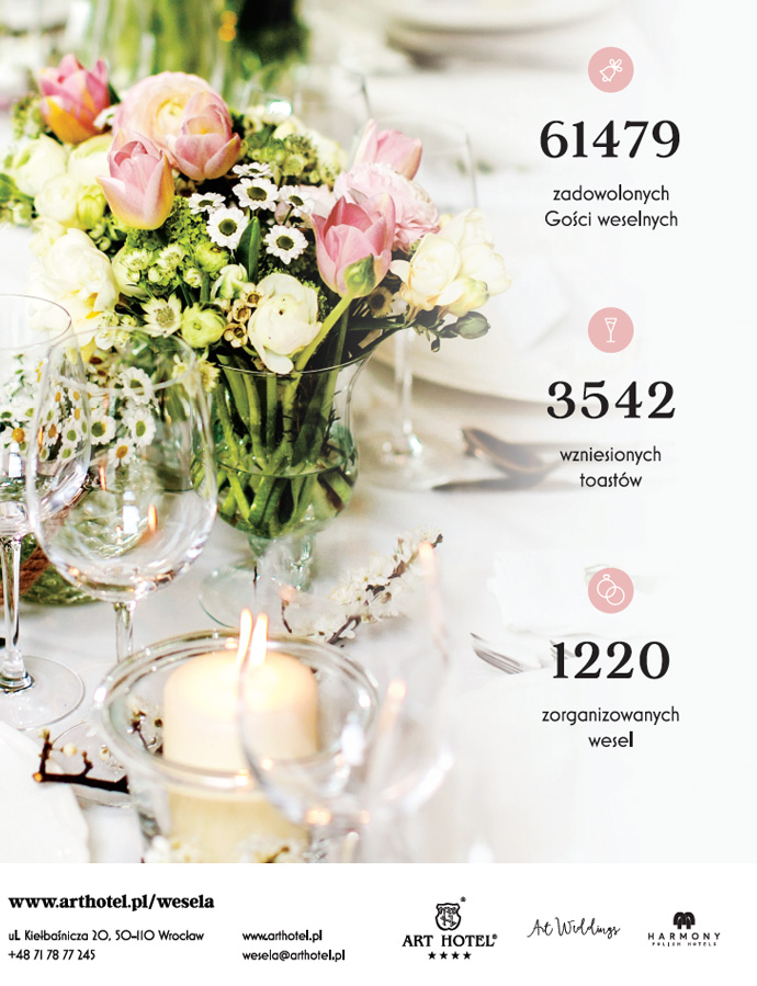 Gdy niektórych naszych tegorocznych nowożeńców nie było jeszcze na świecie, my witaliśmy już pierwszych weselnych gości. Od tego czasu byliśmy obecni w tym najważniejszym dniu u 1220 par. We wnętrzach Art Hotelu na przestrzeni lat odbywały się tradycyjne huczne wesela, wytworne zasiadane bankiety, kameralne rodzinne spotkania, jak i intymne uroczystości ślubne we dwoje. Nasze sale zmieniały swoje oblicza wielokrotnie i na niezliczoną ilość sposobów: jednego wieczoru Sala Ogrodowa przeobraziła się w bajkowy ogród rodem z „Alicji w Krainie Czarów”, innym razem pierwsze piętro oczarowało gości wystrojem zainspirowanym twórczością J.K. Rowling, a niejednokrotnie mieliśmy okazję podziwiać weselne dodatki w stylu rustykalnym. Zwolennicy ślubnej klasyki też znajdą coś dla siebie: eleganckie wnętrza, w których nie brakuje zabytkowych elementów, obsługę na najwyższym poziomie oraz przyjazną parze młodej ofertę All Inclusive.