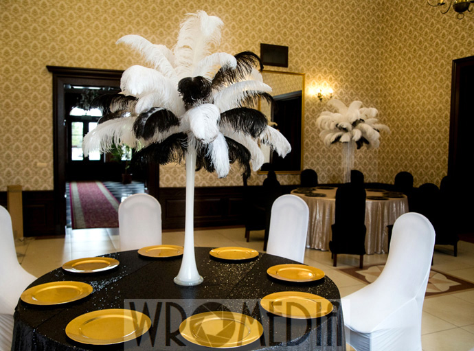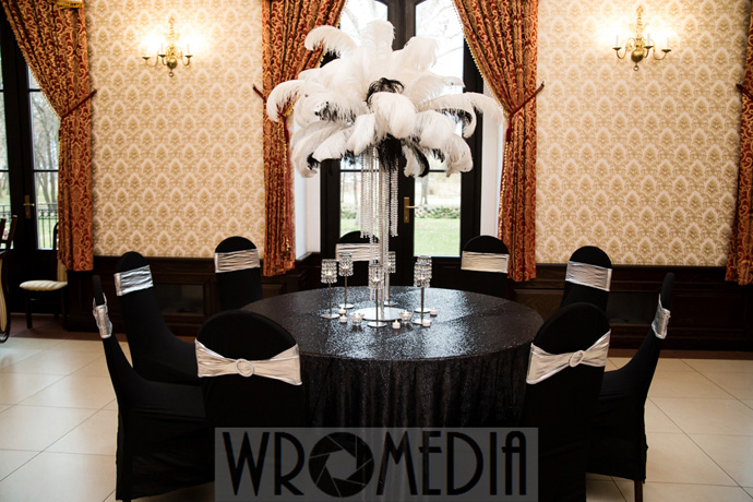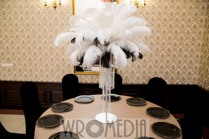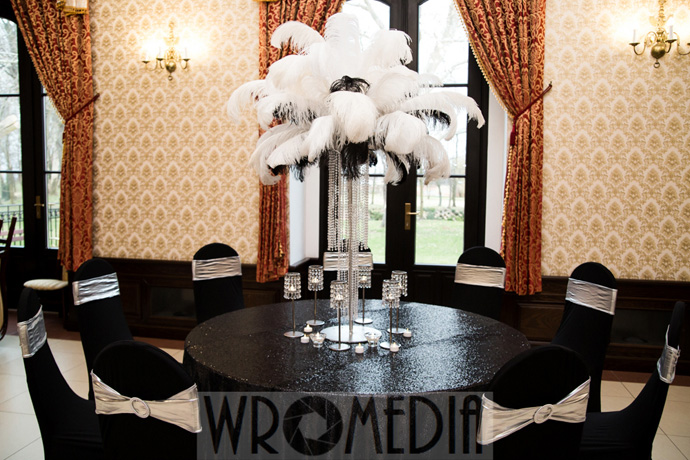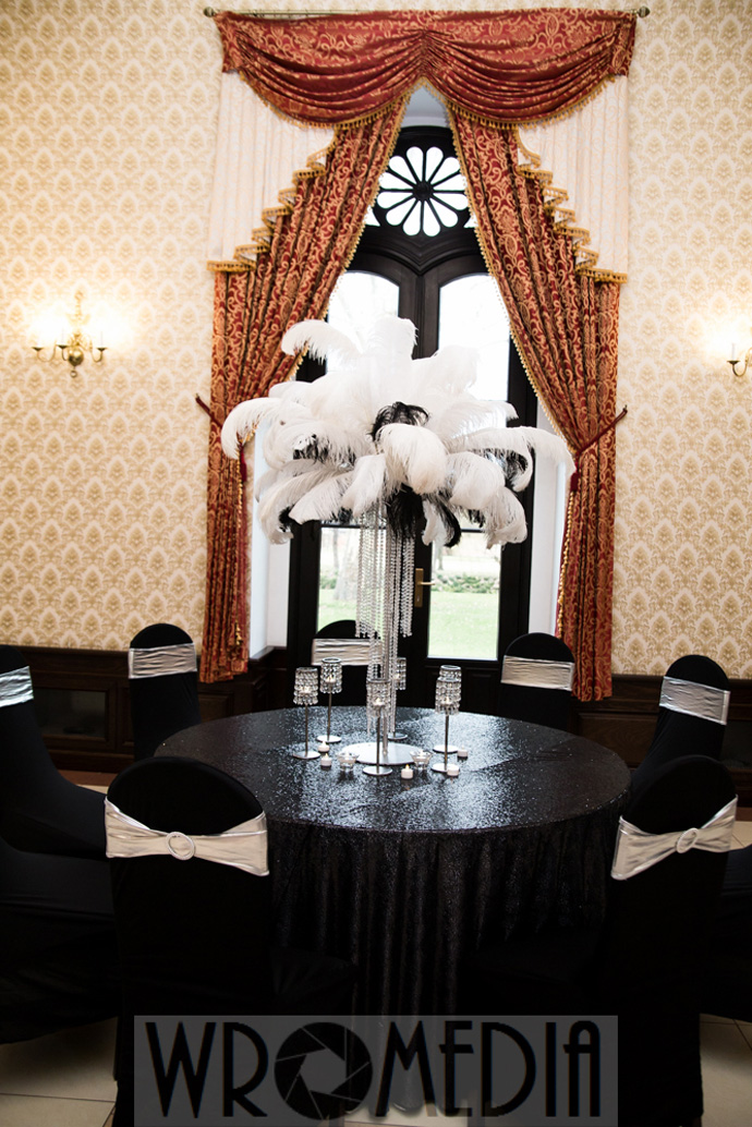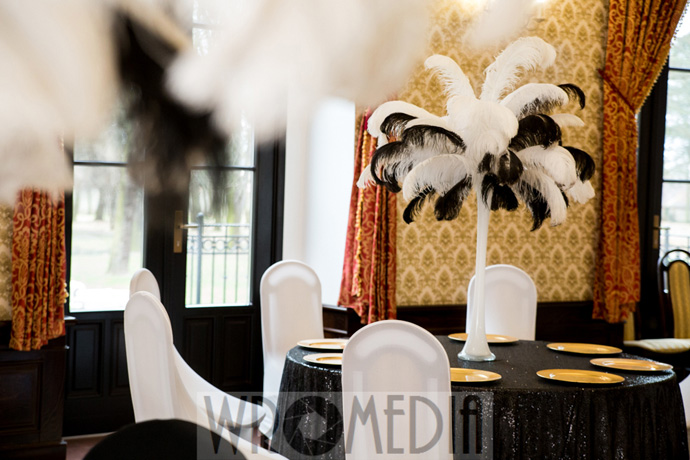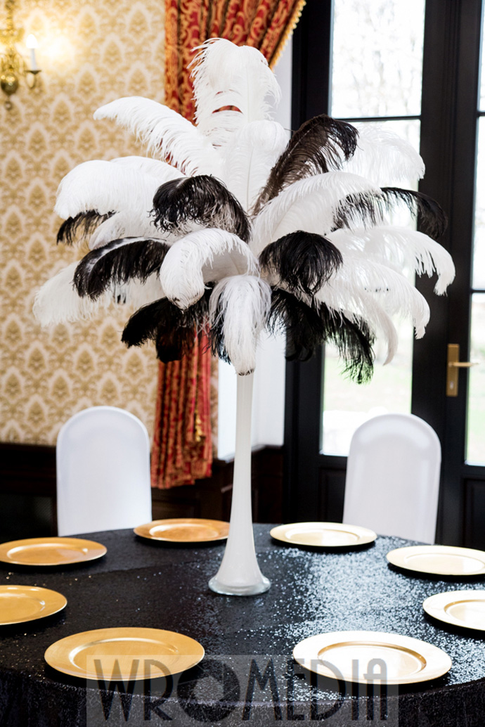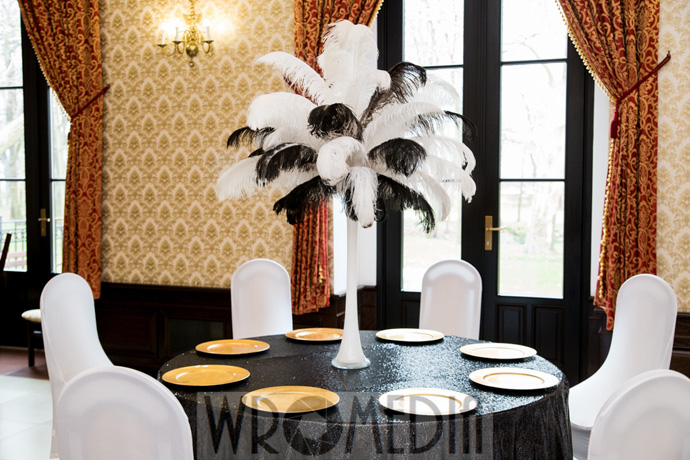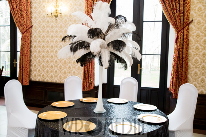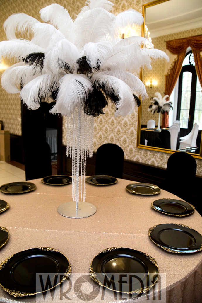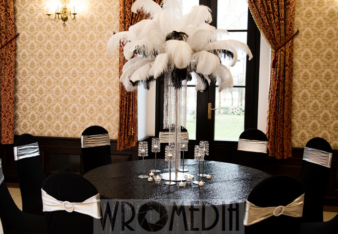 Pierwszą propozycją są piękne, okazałe kompozycje z piór strusich z akcentem w kolorystyce czerni. Do wykończenia stołu proponujemy ozdobne czarne, cekinowe obrusy lub takie w kolorze jasnego złota. Całość wykańczamy ozdobnymi podtalerzami: złoty obrus – czarne podtalerze, czarny obrus – złote lub srebrne podtalerze. Aby stonować całość proponujemy czarne lub białe pokrowce na krzesła. Nie bałabym się czarnych pokrowców, pod warunkiem, że sala nie jest ciemna. Są czarne tylko przez moment, do czasu aż na krzesłach zasiądą wielokolorowo ubrani goście, dla których kreacje czerń pięknie podkreśli. Panowie w ciemnych garniturach na ich tle nie zginą – w umiejętnie i efektownie oświetlonej Sali efekt może być naprawdę spektakularny. Tutaj zachęcamy do zabawy dodatkami. Czerń może być jedynie akcentem, lecz może również w dekoracjach dominować. Każdy może dopasować intensywność do swojej wizji.
