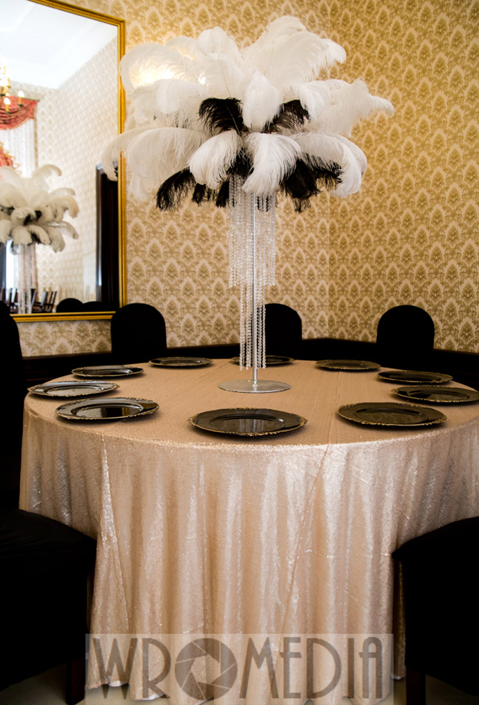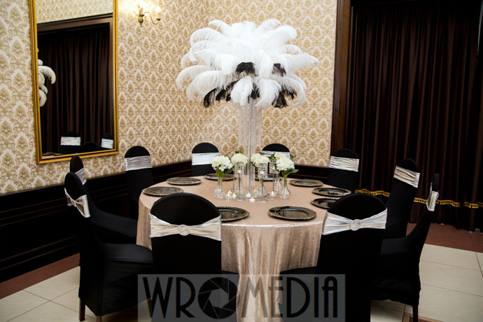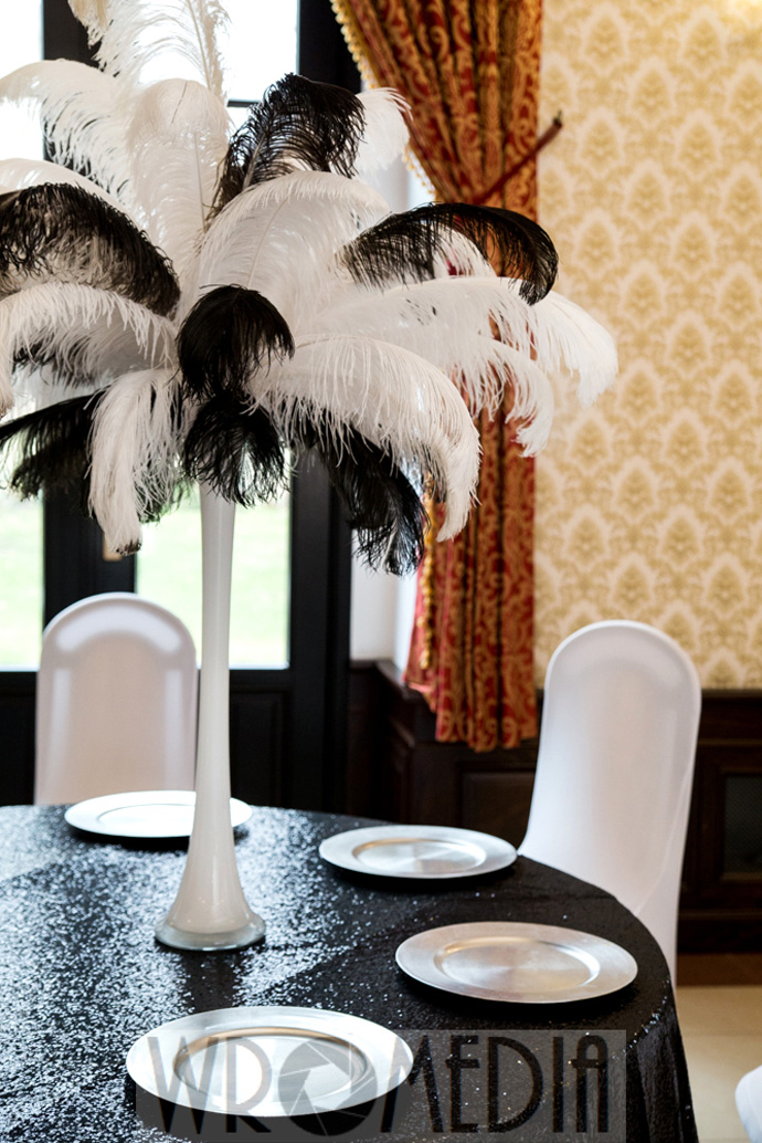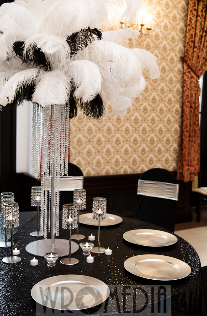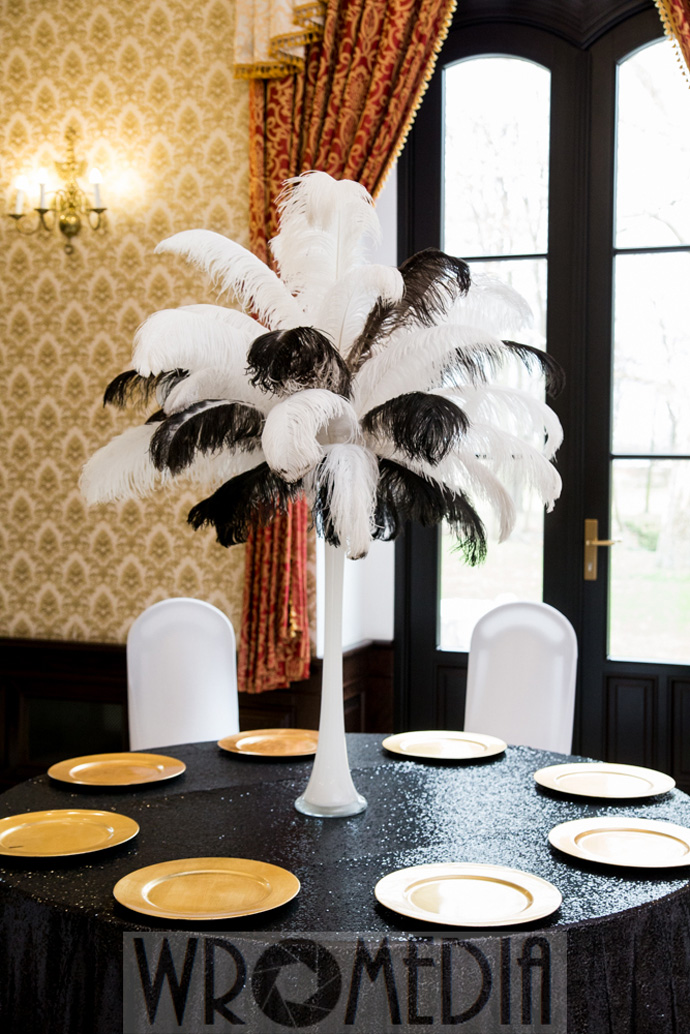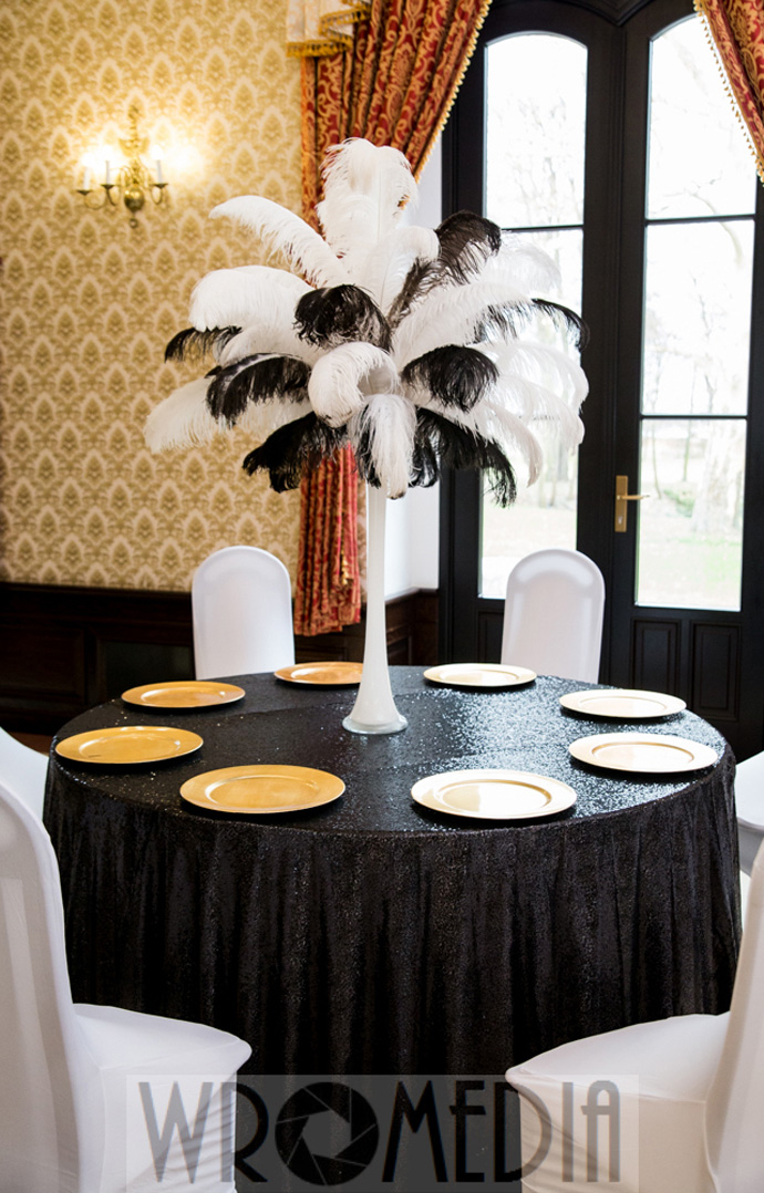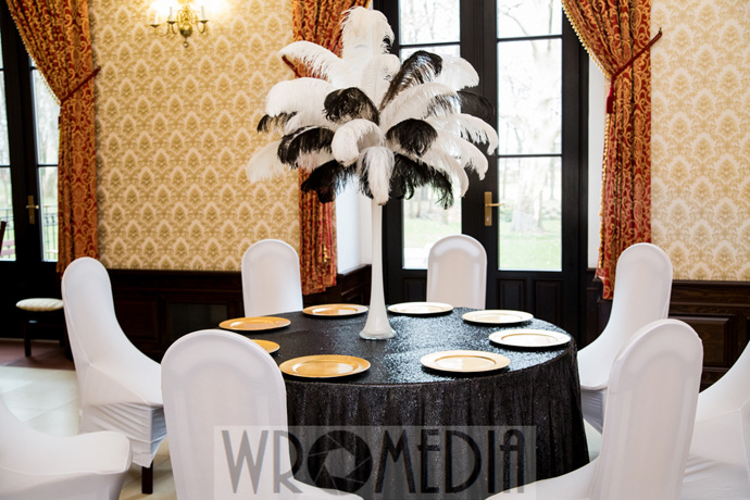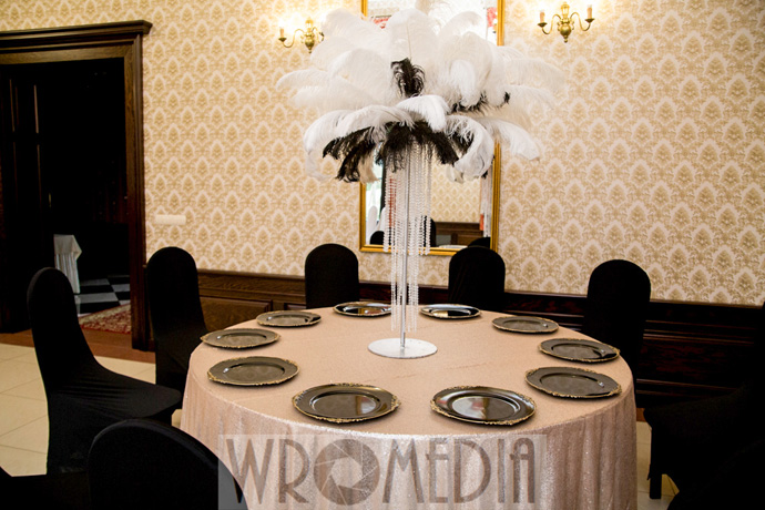 Pierwszą propozycją są piękne, okazałe kompozycje z piór strusich z akcentem w kolorystyce czerni. Do wykończenia stołu proponujemy ozdobne czarne, cekinowe obrusy lub takie w kolorze jasnego złota. Całość wykańczamy ozdobnymi podtalerzami: złoty obrus – czarne podtalerze, czarny obrus – złote lub srebrne podtalerze. Aby stonować całość proponujemy czarne lub białe pokrowce na krzesła. Nie bałabym się czarnych pokrowców, pod warunkiem, że sala nie jest ciemna. Są czarne tylko przez moment, do czasu aż na krzesłach zasiądą wielokolorowo ubrani goście, dla których kreacje czerń pięknie podkreśli. Panowie w ciemnych garniturach na ich tle nie zginą – w umiejętnie i efektownie oświetlonej Sali efekt może być naprawdę spektakularny. Tutaj zachęcamy do zabawy dodatkami. Czerń może być jedynie akcentem, lecz może również w dekoracjach dominować. Każdy może dopasować intensywność do swojej wizji.