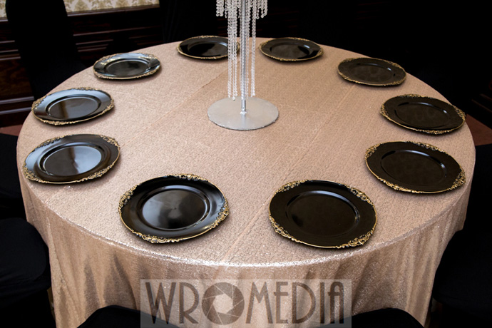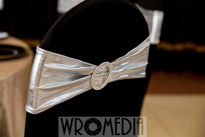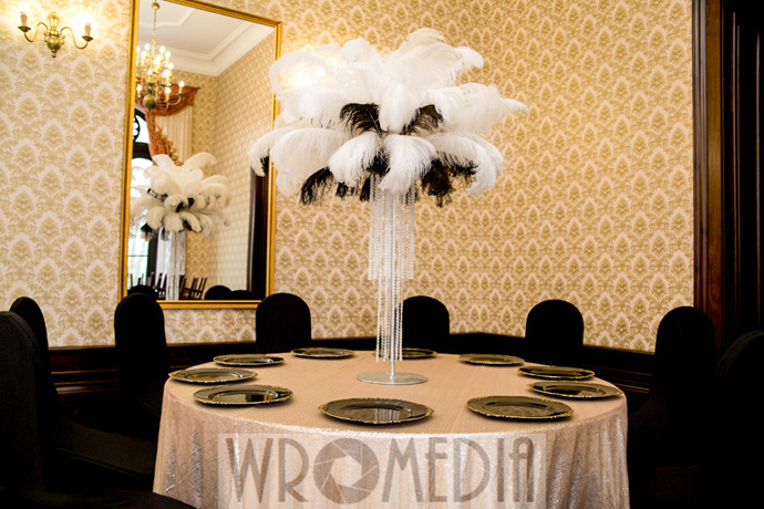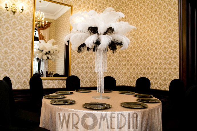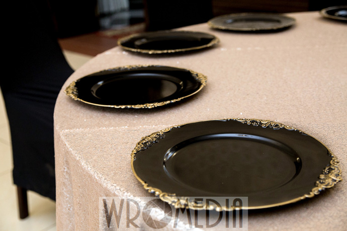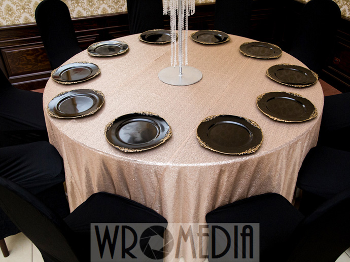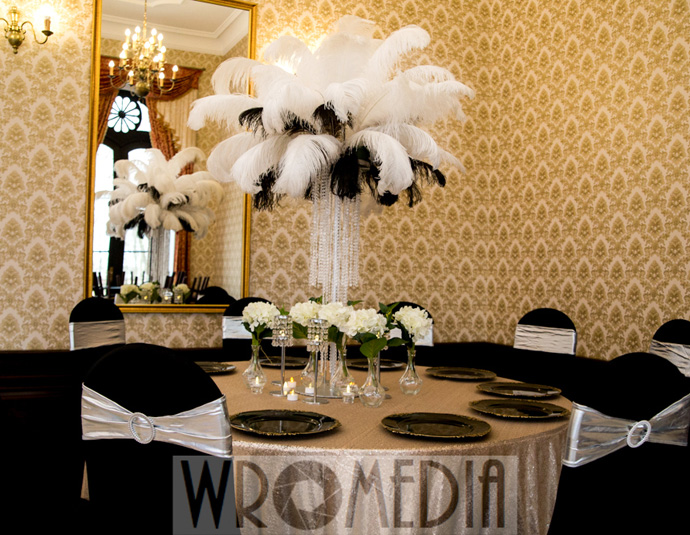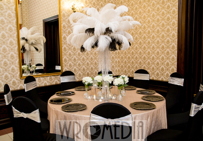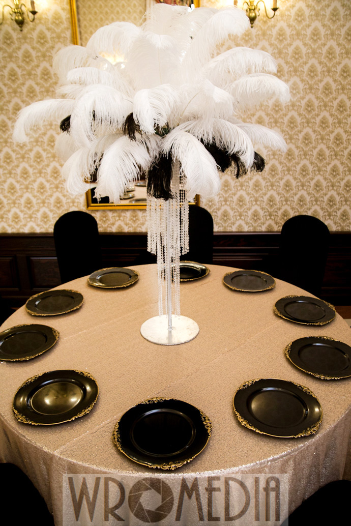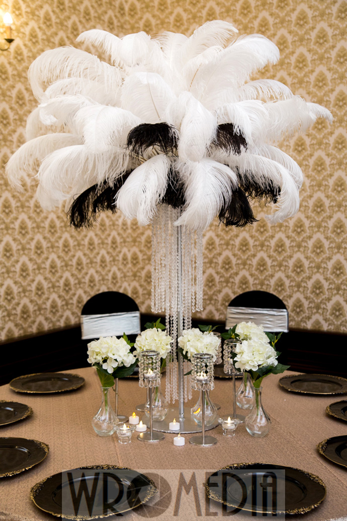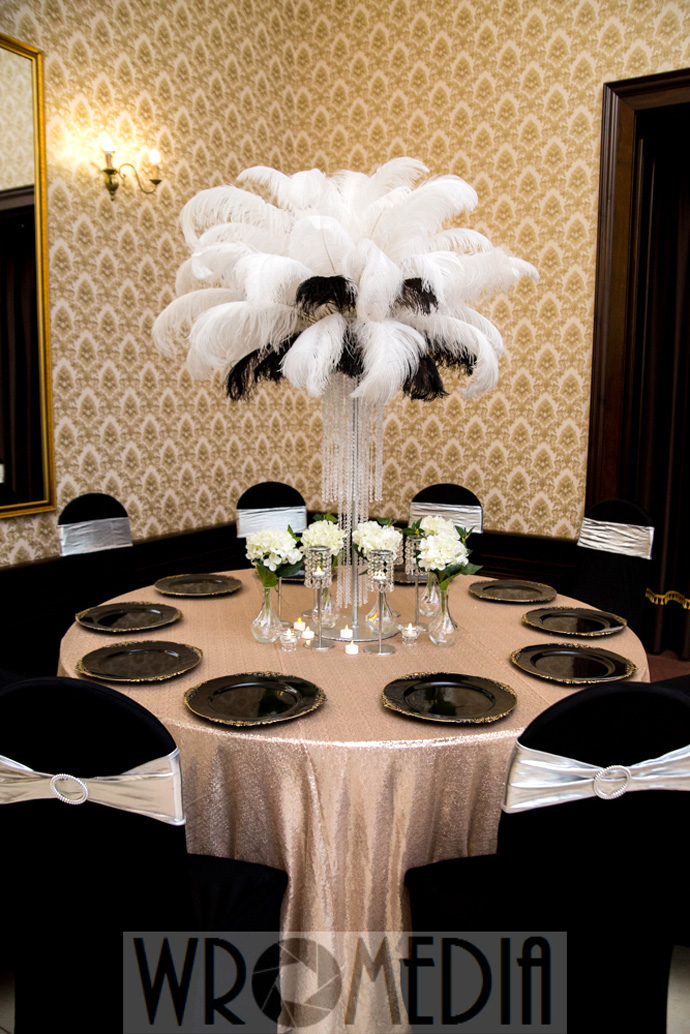 Pierwszą propozycją są piękne, okazałe kompozycje z piór strusich z akcentem w kolorystyce czerni. Do wykończenia stołu proponujemy ozdobne czarne, cekinowe obrusy lub takie w kolorze jasnego złota. Całość wykańczamy ozdobnymi podtalerzami: złoty obrus – czarne podtalerze, czarny obrus – złote lub srebrne podtalerze. Aby stonować całość proponujemy czarne lub białe pokrowce na krzesła. Nie bałabym się czarnych pokrowców, pod warunkiem, że sala nie jest ciemna. Są czarne tylko przez moment, do czasu aż na krzesłach zasiądą wielokolorowo ubrani goście, dla których kreacje czerń pięknie podkreśli. Panowie w ciemnych garniturach na ich tle nie zginą – w umiejętnie i efektownie oświetlonej Sali efekt może być naprawdę spektakularny. Tutaj zachęcamy do zabawy dodatkami. Czerń może być jedynie akcentem, lecz może również w dekoracjach dominować. Każdy może dopasować intensywność do swojej wizji.