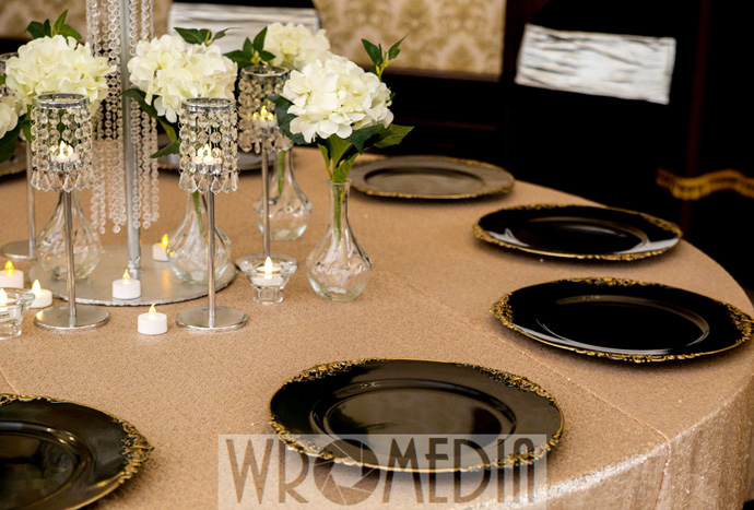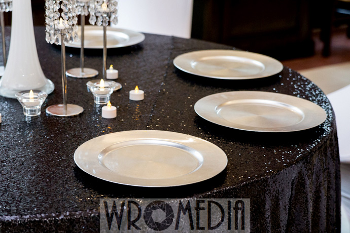 Zobaczcie kilka propozycji dekoracji stołów gości w kolorystyce biel + czerń z dodatkiem kolorów metalicznych – złota oraz srebra.