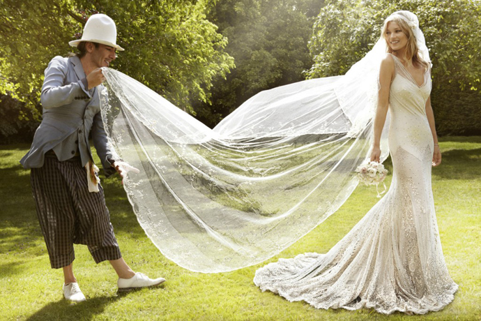 Orędowniczką stylu boho była między innymi Kate Moss, która na swój ślub wybrała luźną sielską stylizację – opływającą ciało suknię, rozpuszczone włosy, upięty welon w stylu juliett cup, minimalistyczny makijaż i skromny bukiet. Wspaniałe tło i główny motyw sesji dostępnej dla mediów stworzyła drużyna druhenek w białych sukienkach, monochromatycznych bukiecikach i wiankach. Co prawda suknia Kate do tanich nie należała i wszyscy odjechali orszakiem Rollce Royce-ów, lecz nie o oszczędności tu chodziło, ale o efekt.