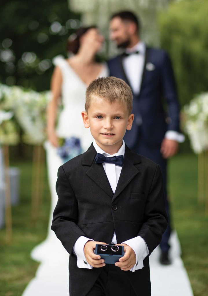 Kuszącym pomysłem dla kilkuletniego chłopca jest nawiązanie do stylizacji weselnej taty. W przypadku chłopców wygląda to całkiem fajnie, szczególnie jeśli młodzieniec jest wpatrzony w ojca i będzie miał z takiego kopiowania poczucie dumy. Wybierzcie taki sam kolor garnituru, a nawet fason czy dodatki – całość może, ale nie musi być identyczna, by zrobić fajne wrażenie.