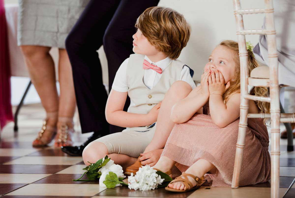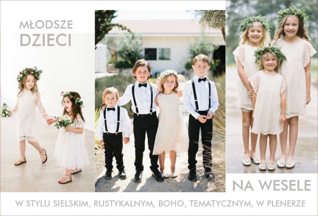 Ciekawym pomysłem jest także identyczne ubranie chłopców w podobnym wieku – czy to braci, czy zaprzyjaźnionych kuzynów. Szczególnie jeśli pełnią funkcję małych drużbów i idą w orszaku ślubnym. Stopień podobieństwa można dawkować, bo to przecież koszty, by wszystkich ubrać identycznie. Ale czasem wystarczy kupić identyczne muszki i umówić się, że chłopcy włożą na wesele szare spodnie i białe koszulki (a te ma większość), i efekt murowany.