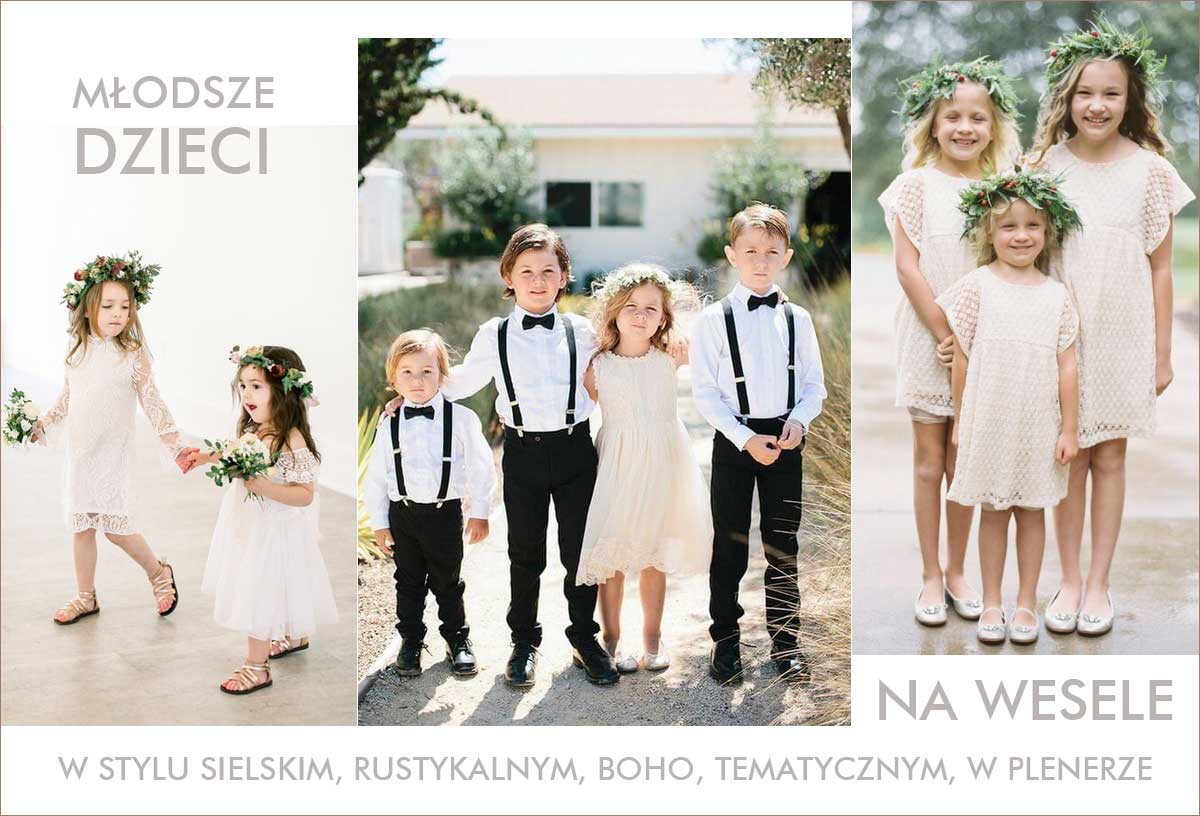 Na wesela młodszych chłopców najczęściej ubieramy w jasne kolory, pastele, szarości, beże, błękity. Koszule nie muszą być białe, lecz jasne, a jeśli we wzorki to subtelne. Mówię tutaj o luźniejszych stylizacjach. W przypadku stroju formalnego obowiązuje, tak jak u dorosłych mężczyzn – biała koszula. Jeśli dysponujecie bliższą wiedzą na temat charakteru miejsca wesela, motywu przewodniego czy kolorystyki – można to wykorzystać. Choćby przez dopasowanie kolorystyczne muszki czy szelek. Na przyjęcie w eleganckim hotelu czy pałacyku polecałabym czarne lub granatowe spodnie, białą koszulę i muszkę. Więcej możliwości stylizacji daje nam ślub w plenerze z weselem w stylu boho czy rustykalnym. W przypadku dzieci potraktowałabym te kolorystyczne wskazówki bardzo ogólnie.