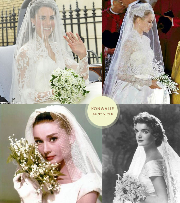 Podziwiane przez nas ikony stylu – Grace Kelly, Jacqueline Kennedy i całkiem niedawno Księżna Kate – wybrały bukiety z konwalii (lub z ich przewagą), równoważąc tym samym przepych oprawy dworskich ceremonii.