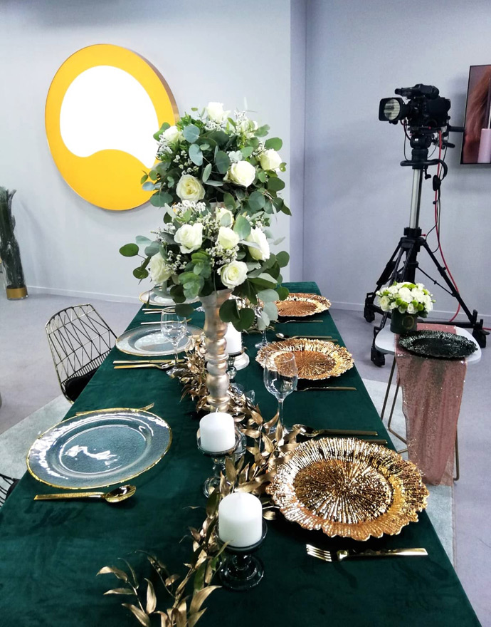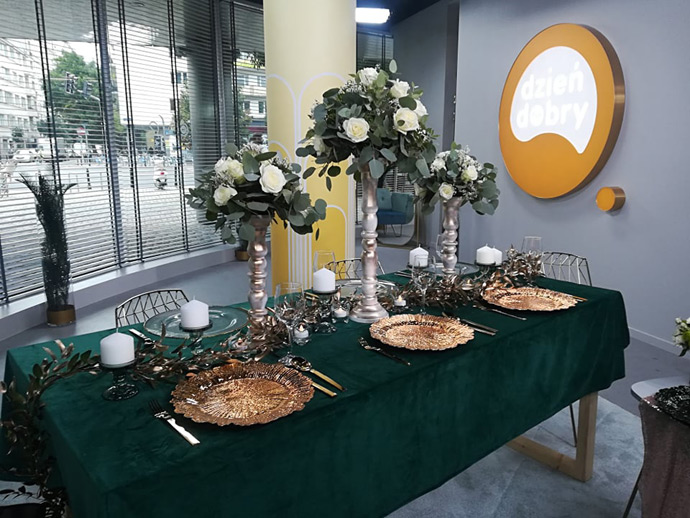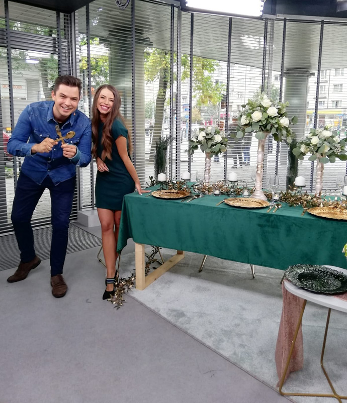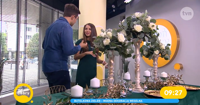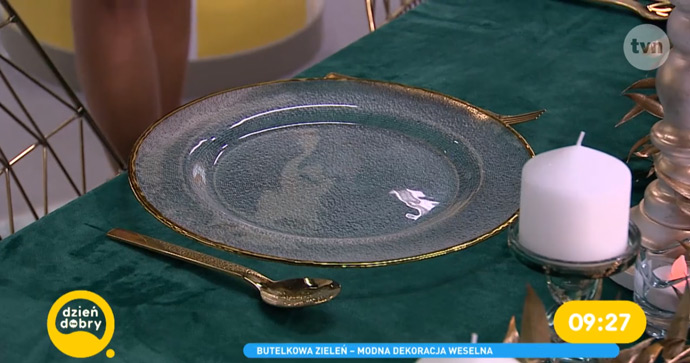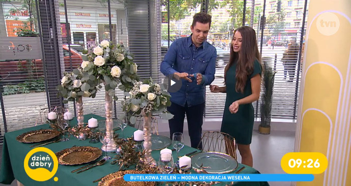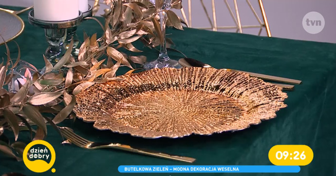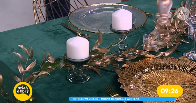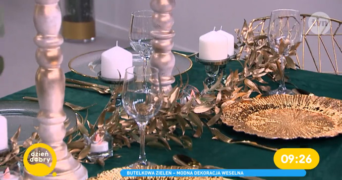 Latem 2019 rządził kolor koralowy, który pięknie współgrał z elementami metalicznymi i złotem. Jesień została zdominowana przez butelkową zieleń. Zdaniem dekoratorki ślubnej Martyny Gabriel butelkowa zieleń jest ponadczasowa i niezwykle elegancka. Zieleń kojarzy nam się z naturą, ekologią, stylem rustykalnym, ale jak udowodniła Martyna, zieleń można pokazać również w innej odsłonie. Butelkowa zieleń idealnie komponuje się ze złotem. Dzięki takiemu połączeniu kolorystycznemu osiągniemy pałacowy klimat. Dekoratorka ślubna w kawiarence Dzień Dobry TVN zaprezentowała różnego rodzaju podtalerze złote i zielone, zielony obrus, świeczniki i kwiaty, które pasują do tego wystroju.