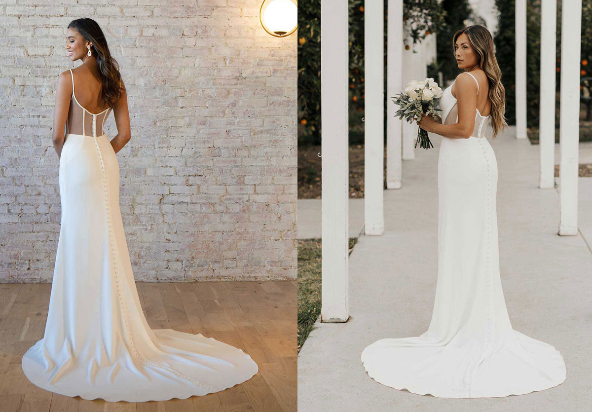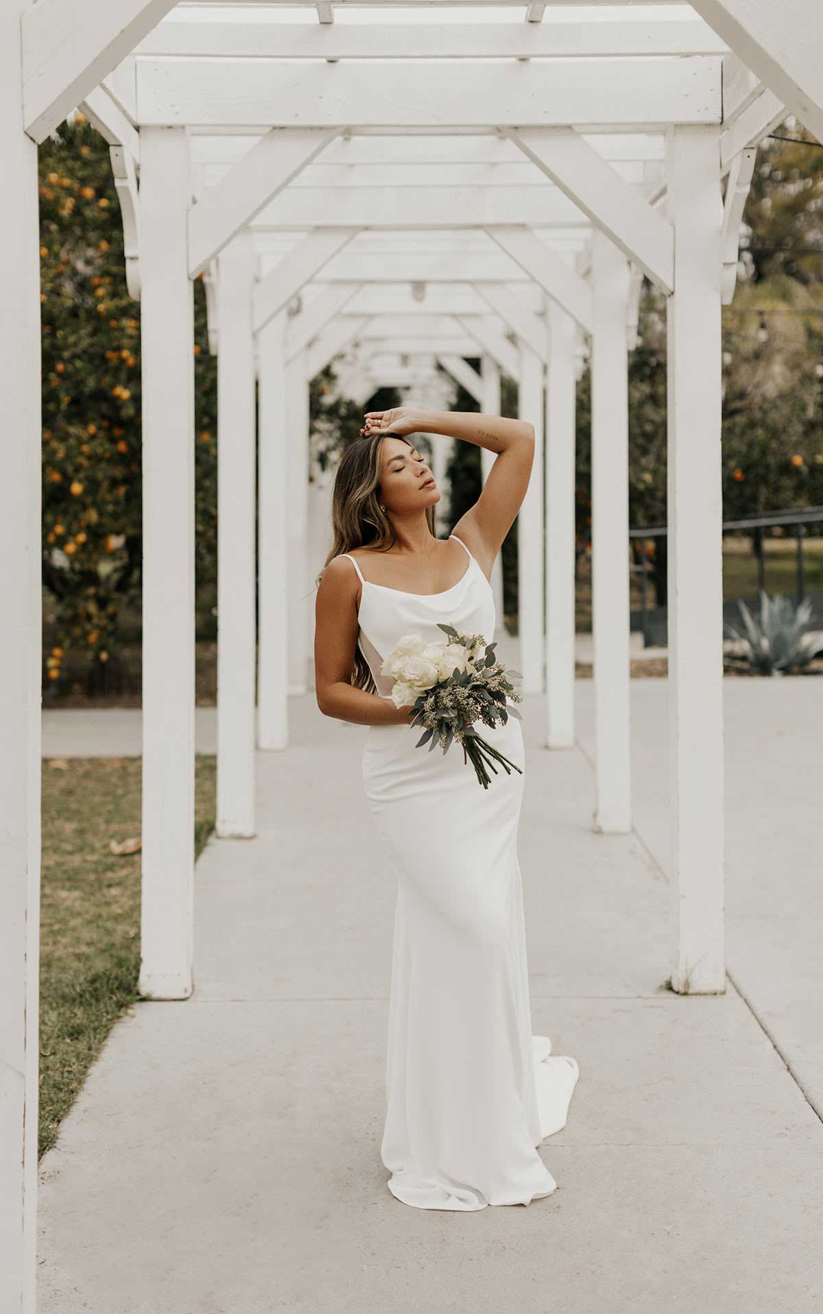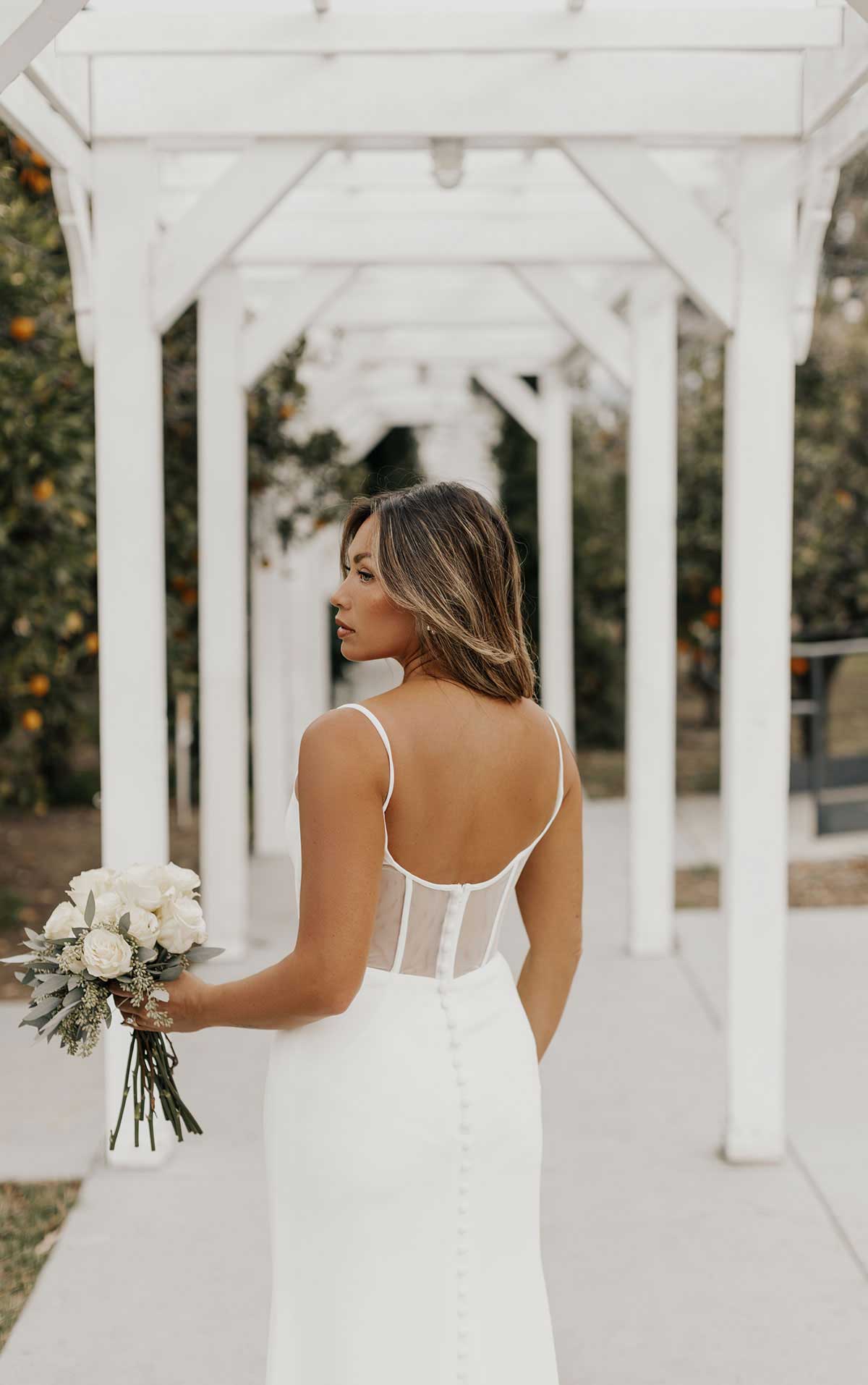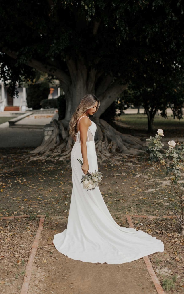 Ten model wpisuje się w jeden z zauważalnych trendów w sukniach ślubnych na sezon 2023 – purystyczny i minimalistyczny. W nurcie prostej elegancji, który bliski jest kobietom nie przepadającym za przegadanymi sukienkami. Panna młoda w tej sukience wygląda niezwykle kobieco, seksownie i nowocześnie. Szczerze – bardziej podoba mi się ta sukienka właśnie na pani z ciałkiem. Doceniam też niebanalny zabieg w postaci półprzezroczystych klinów pod pachami. Optycznie zrobił talię i nadał sukni, podobnie jak przezroczystości na plecach – unikatowego charakteru. I podejrzewam, że materiał w dotyku jest boski:)