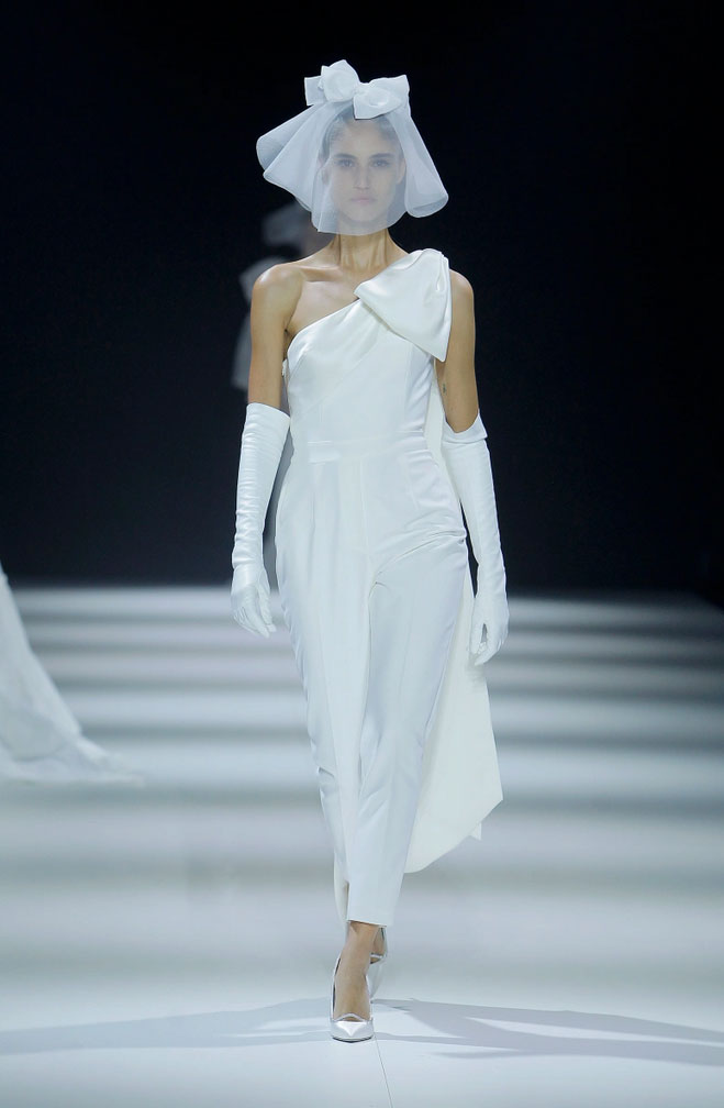 Nie jest to nowy trend, w dodatku mocno niszowy, ale wart zaznaczenia ze względu na nietypowe połączenia. Panna młoda w skąpym gorsecie i cygaretkach, a jednak płaszczowa narzuta przechodząca w tren ewidentnie kojarzy się ze ślubną stylizacją. Zabawą w damsko-męską wersję panny młodej jest interesujące połączenie garnituru z tiulowym trenem. Mocno artystyczne i odważne, a jednak powiedziałabym, że do włożenia nawet u nas. Spodnium wiadomo – gdzieś tam się przewija w kilku kolekcjach każdego roku. Ale spójrz na tę pannę młodą w woalce o rękawiczkach – czy na przykład nie mogłaby tak się wystylizować ekstrawagancka kobieta po 40-tce na swój kolejny ślub? – Taki luźny pomysł:)