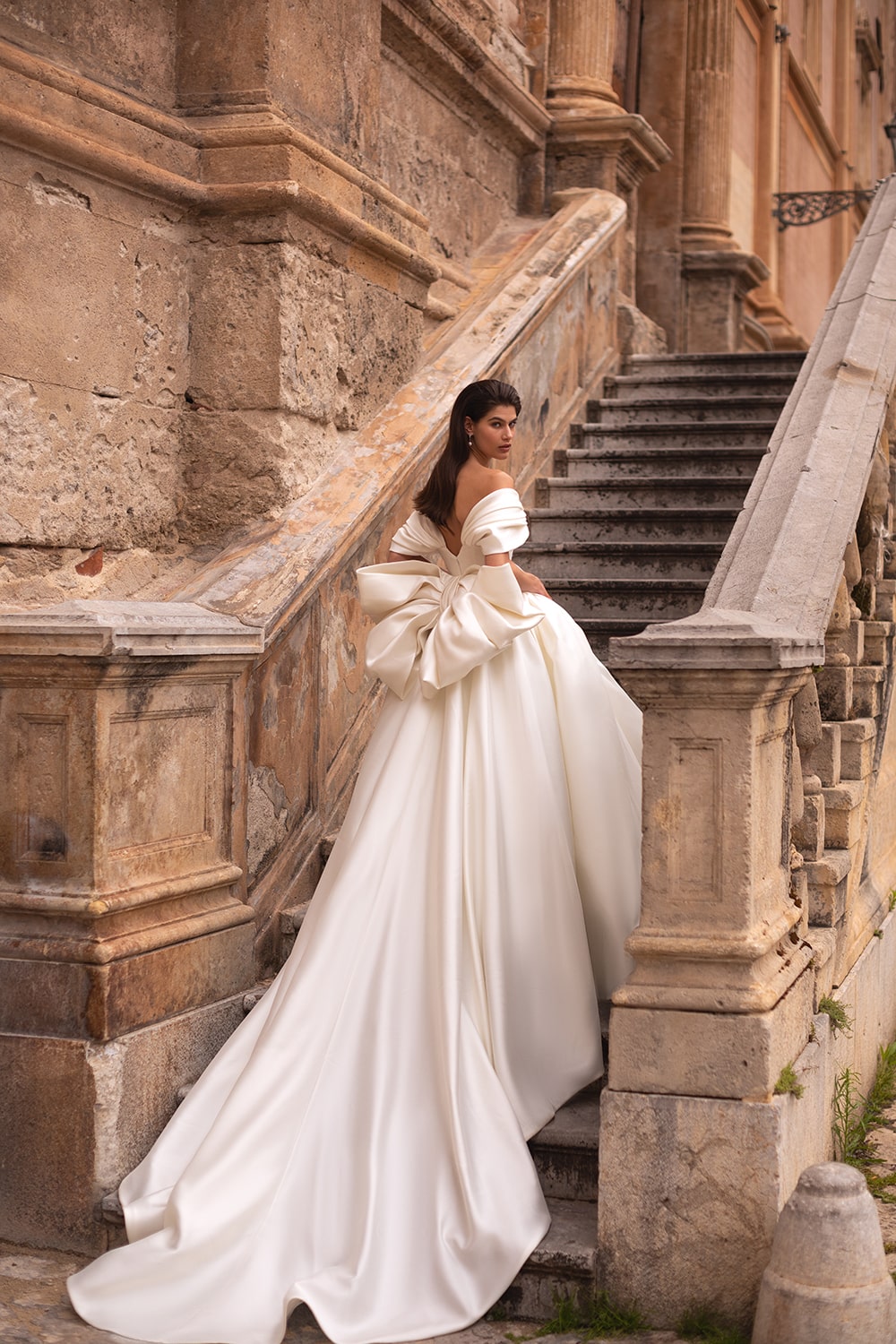 Gładkie suknie ślubne z kokardami w stylu Hollywood