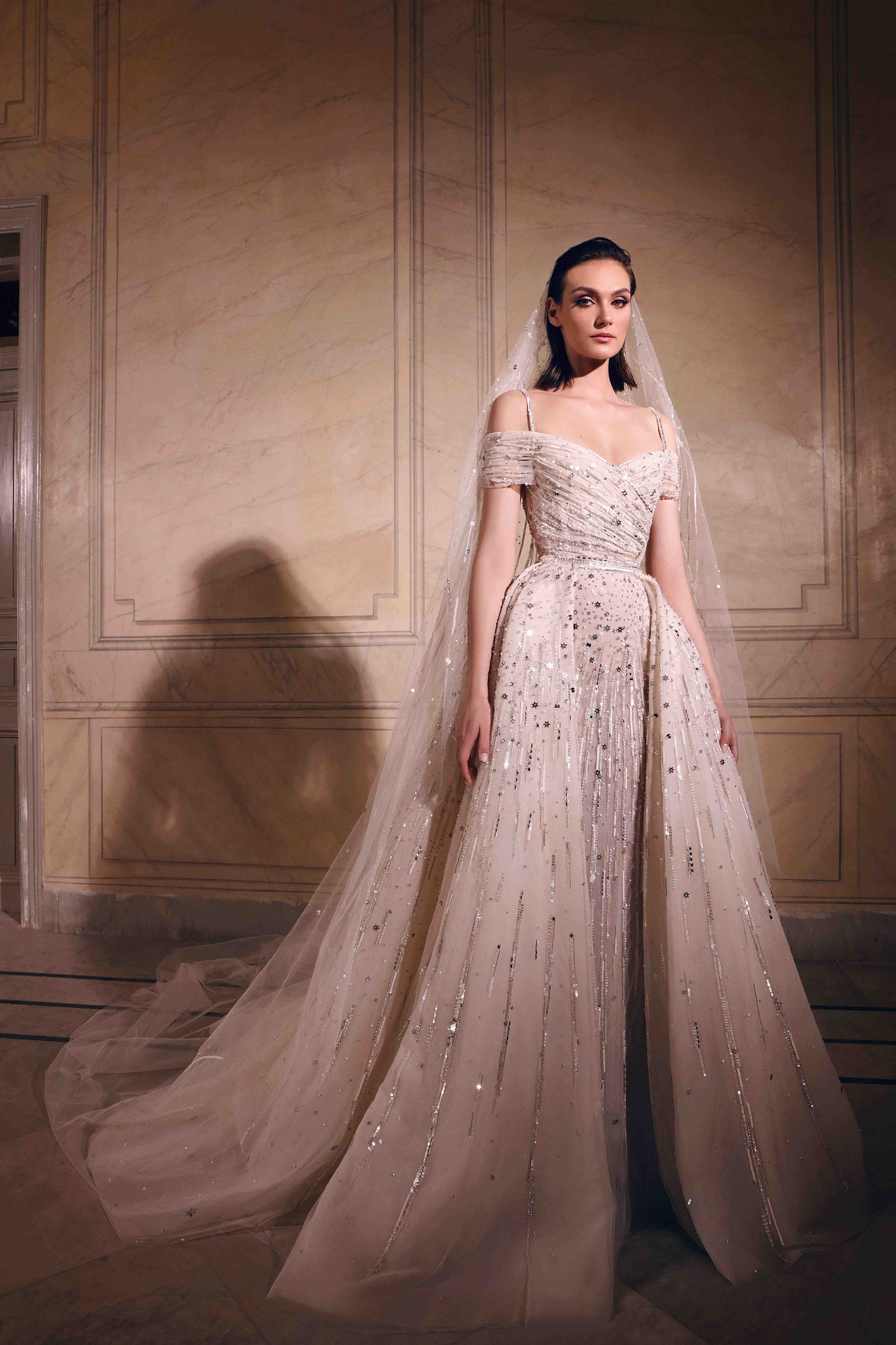 Wzory gwiazd wirują na przezroczystych tkaninach, haftowanych i otaczanych krystalicznymi iskierkami w różnych konstelacjach, aby uzyskać eteryczny połysk. W kolekcji suknie księżniczek ze ściągniętymi taliami podkreślają skrzące cekiny, a jedwabny tiul otula ramiona w delikatnym uścisku. Zauważcie, że suknie ślubne w tej kolekcji oscylują wokół palety ecru i pudru. Świetliste akordy różnorodnych odcieni szczególnie uwydatniają delikatność tkanin.