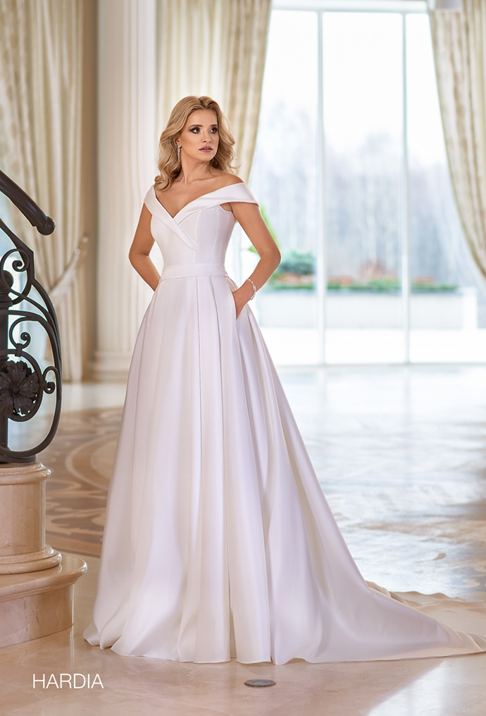 Znajdziecie też suknie satynowe lub z mikado, minimalistyczne, eleganckie, bez żadnych dodatkowych ozdób. Tutaj perfekcyjny krój i dopasowanie zrobią całą robotę, by panna młoda prezentowała się ponadczasowo.