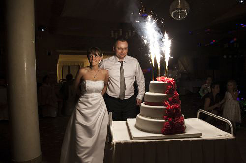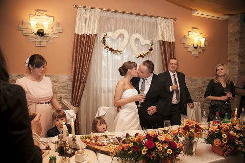 Później były życzenia. Na sali czekali już na nas goście i rodzice, którzy przywitali nas chlebem i solą. Zaprosiliśmy wszystkich do środka, a sami weszliśmy na końcu – oczywiście mój mąż przeniósł mnie przez próg. Zostało odśpiewane sto lat, a w tym czasie stukaliśmy się kieliszkami z szampanem ze wszystkimi gośćmi.